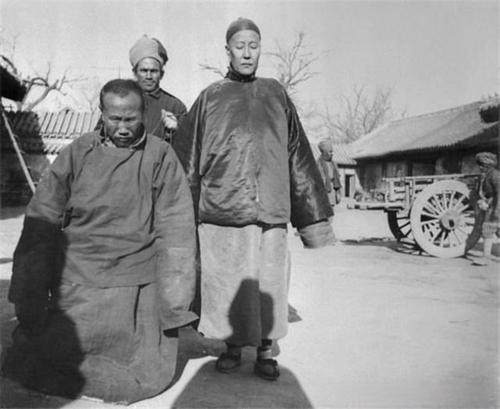 这张照片拍摄于1900年八国联军侵华、慈禧太后携光绪帝仓皇西逃之后的北京紫禁城。图中跪地的是一名留守在紫禁城的老太监,他并非被锡克兵抓捕,而是在向已经逃跑的慈禧太后“跪安”,站在他身后的锡克兵,是隶属于英军的英属印度士兵,他们的任务是在联军占领北京期间,负责看守和维持秩序。 慈禧西逃时,带走了部分亲信太监,而大量底层太监被遗弃在紫禁城内。在联军占领的数月间,这些太监失去了所有的权力和庇护,生活困顿,甚至连基本的生存都难以保障,成为了国家沦陷时最无助的牺牲品。