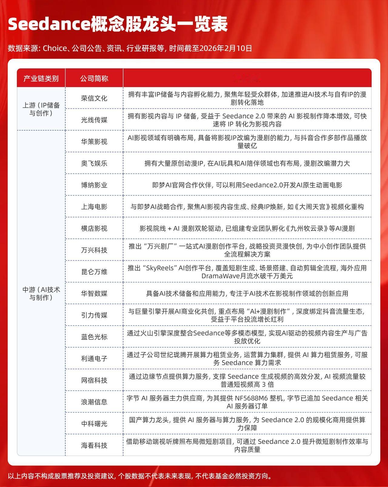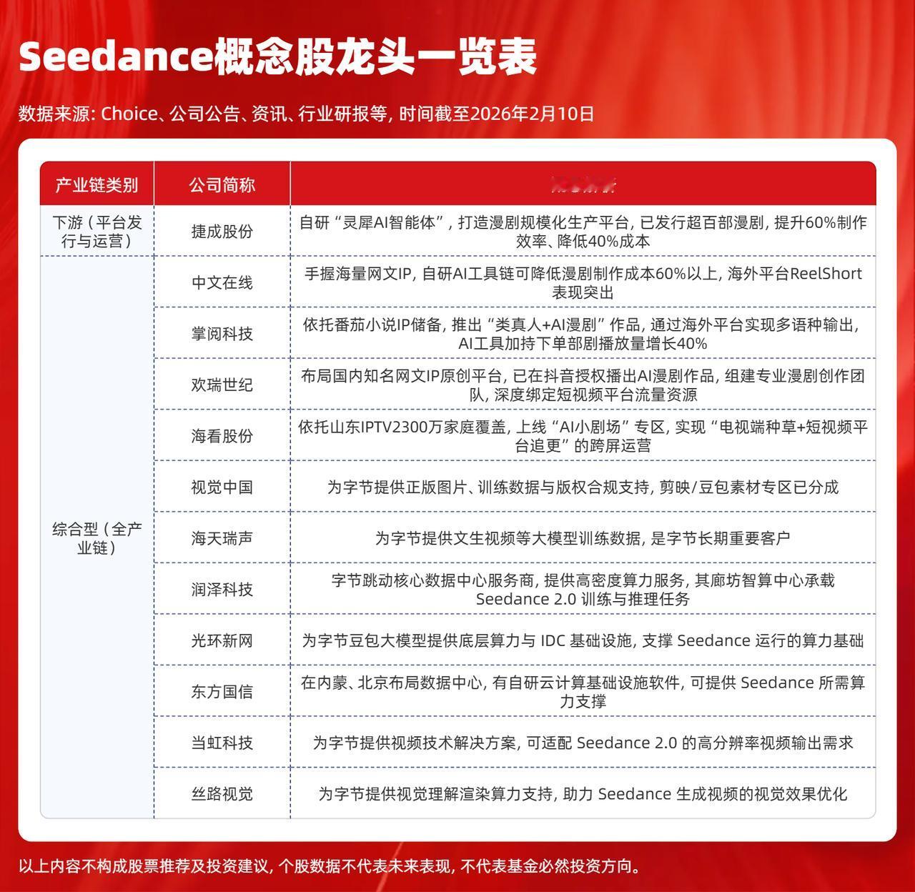 Seedance概念股一览表(建议收藏) (向右滑动图片查看完整名单) 近日,字节跳动新一代视频生成模型Seedance 2.0重磅亮相,它在即梦、豆包等平台开启小范围内测即热度不断。 不仅掀起了全球AIGC 行业的技术变革,更催动了A 股市场影视传媒、AIGC、算力基建等板块应声大涨。 Seedance概念是什么意思? Seedance 概念是 A 股资本市场中,围绕字节跳动自研的 Seedance 系列 AI 视频生成大模型(核心为 2.0 版本)形成的概念股统称。 具体来看,Seedance概念股指的是,与该模型的IP储备与创作、AI技术与制作、平台发行与运营等产业链各环节深度绑定,能承接其技术落地与商业化发展红利的上市公司群体。