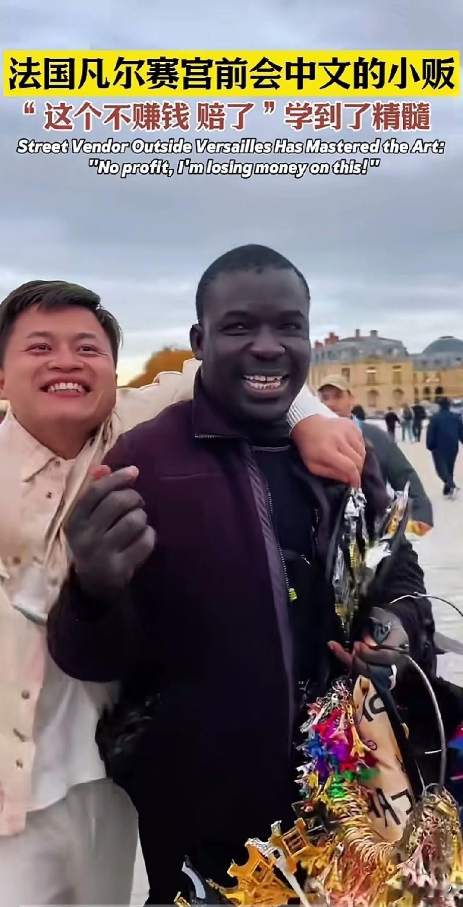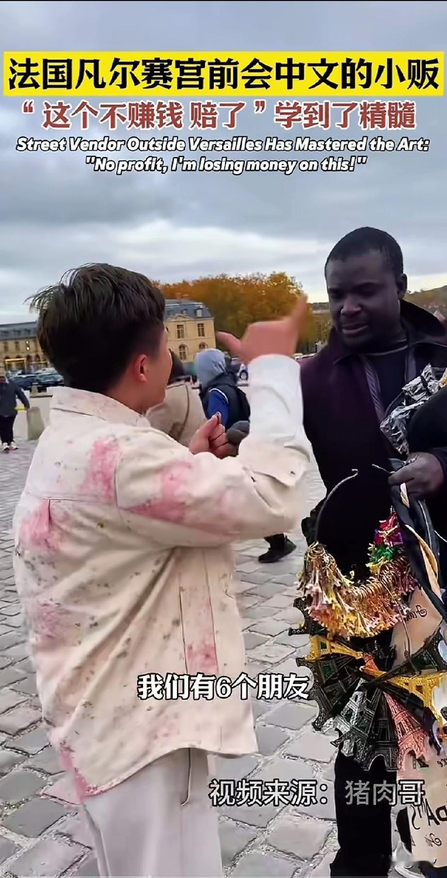 男子和朋友在法国的凡尔赛宫旅游,出门后看见了一个黑人小哥在卖小商品!想着来这儿了,咋说也得买点纪念品! 就是对着黑人小哥喊我要买5个,以为黑人小哥听不懂,还伸出了5根手指头!结果黑人小哥会说中文! 这可把网友高兴坏,他说我要买5个,但是我有6个朋友,你可以送我一个吗?黑人小哥看到他本来想溜走! 结果被这位大哥给拽住了,硬生生的付了5个的钱,看到他们在录视频,虽然小哥说送给他们一个! 大哥开心的和黑人小哥进行合影,还说这茄子,结果黑人小哥说送你一个我都不赚钱,赔了!太逗了! 大哥一起旅游的女生,一路上笑的不停,看到他们两个人太搞笑了,网友表示,人家好不容易从义乌进的货!结果又被大哥买回去了! 大家对于网友在凡尔赛宫外遇到会说中文的黑人小哥好玩吗? 旅行 外国友人在巴黎 外国人到店消费 法国黑人 凡尔赛宫旅游