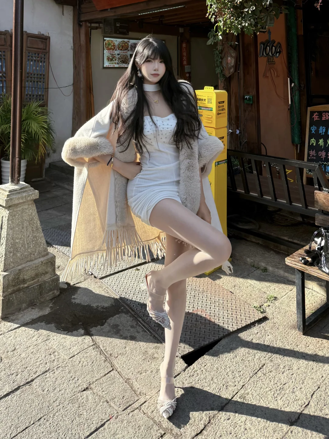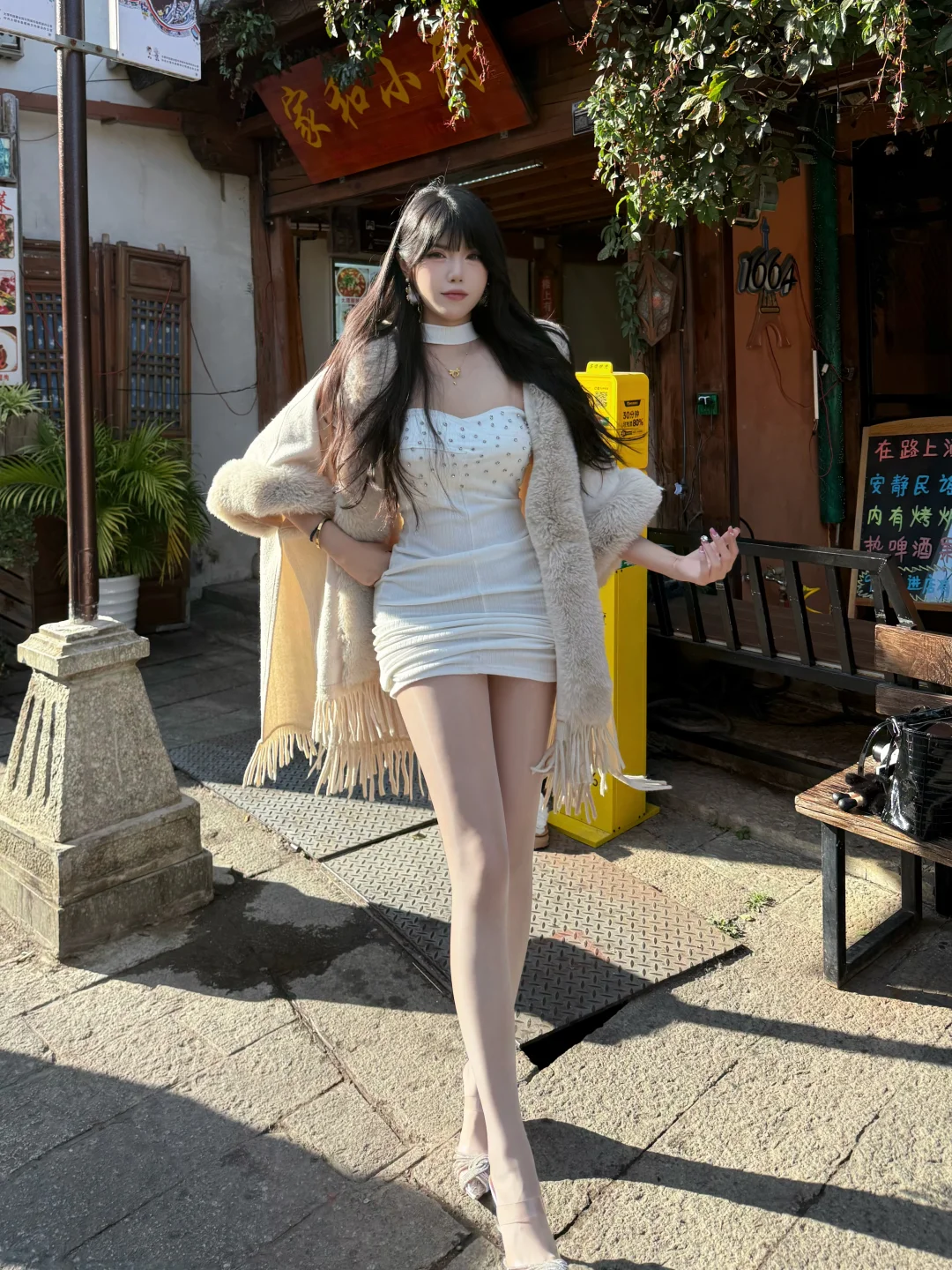 光之影&AI温柔气质穿搭,白色吊带裙搭配长袖衬衫,优雅动人。白衬衫裙穿搭白