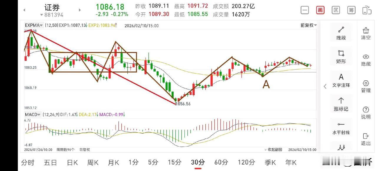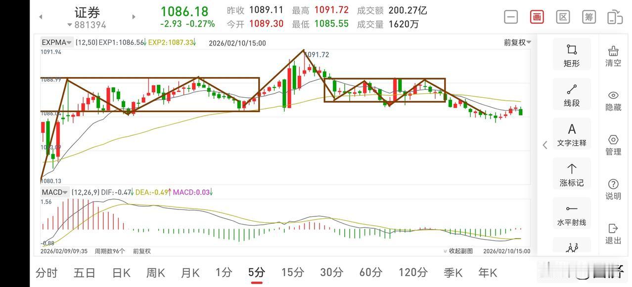 证券板块复盘(2026.2.10) 今天下午证券板块走势比较弱,没能像预期一样强势向上突破,而是走了一个5分钟上的延续下跌如图一,目前处在5分钟中枢下方运行,那么明天就要看能否强势向上突破中枢上沿,从而走出震荡向上的走势,我觉得问题不大。不过在此处操作上还是需要保持足够的耐心,股市上涨自有它的运行逻辑,不可能让你一口吃成胖子的,而且这里是底部区间,各级别的转换相当频繁,总体而言,是一个逐步摆脱底部区间的过程,无忧。从30分钟图二上看,目前就是一个30分钟中枢的构建,只要中枢没有完成,那么这笔日线的上涨就不能判断为结束,所以此处持股观察即可。证券板块解析 为什么券商比银行更有投资价值