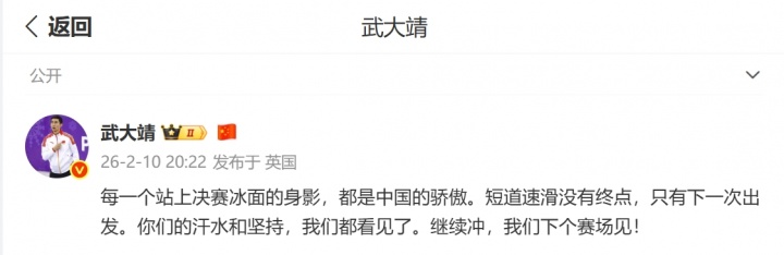 前短道速滑运动员武大靖发布社媒鼓励中国队:每一个站上决赛冰面的身影,都是中国的骄傲。短道速滑没有终点,只有下一次出发。你们的汗水和坚持,我们都看见了。继续冲,我们下个赛场见!