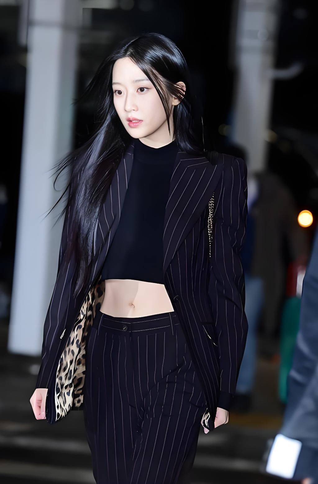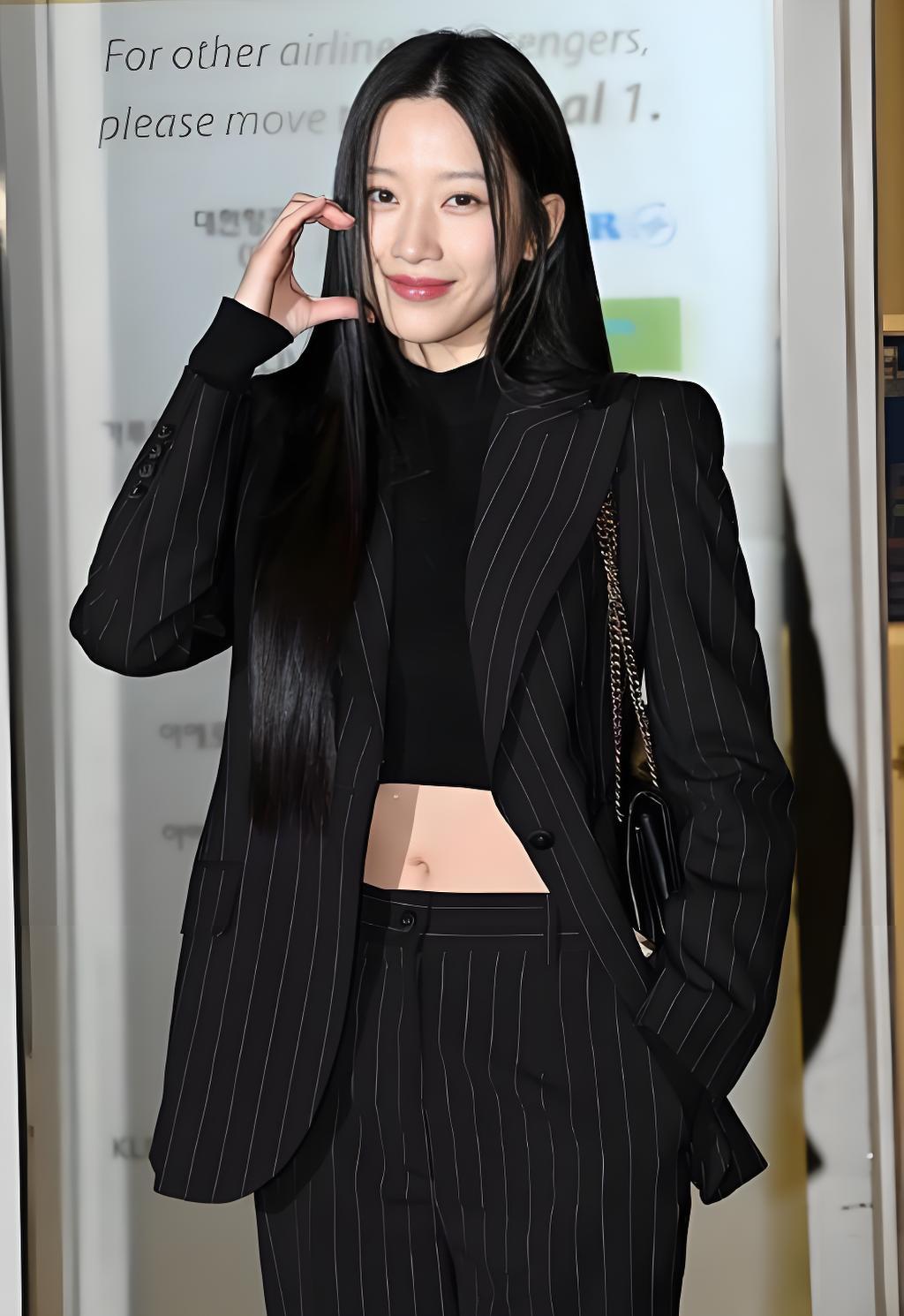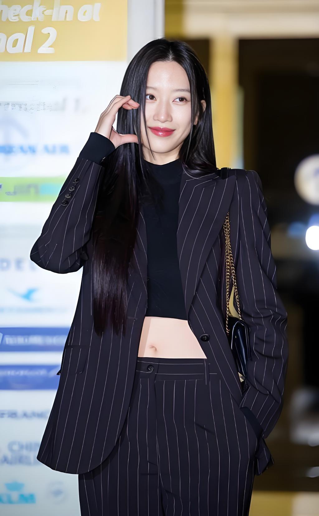 韩国美女模特文佳焕搭配黑色条纹西装,尽显魅力女神风范。