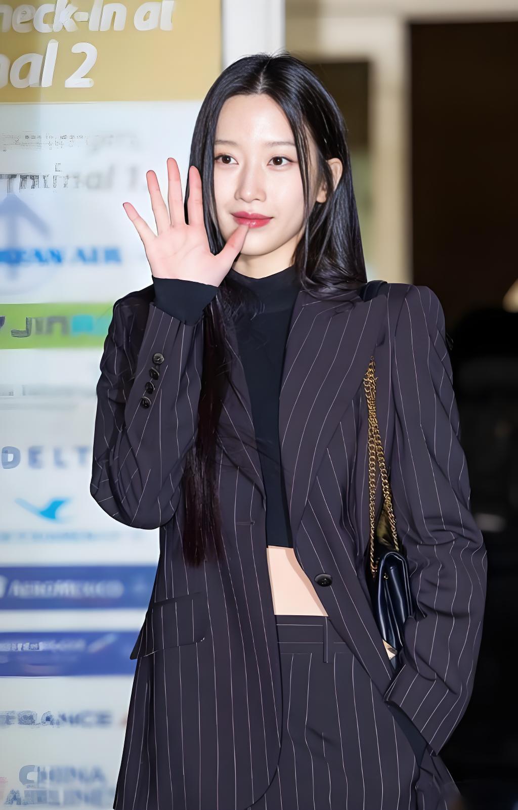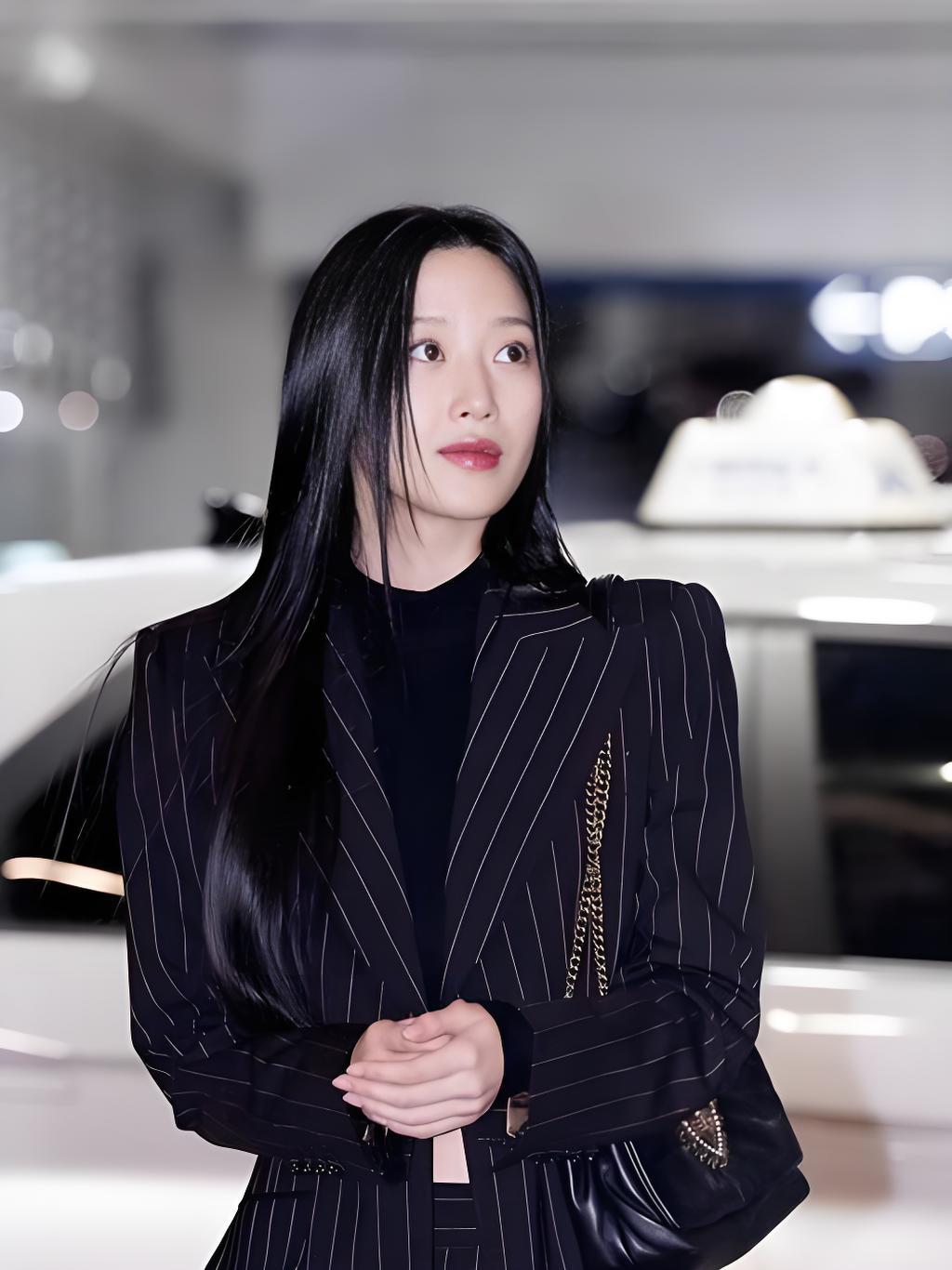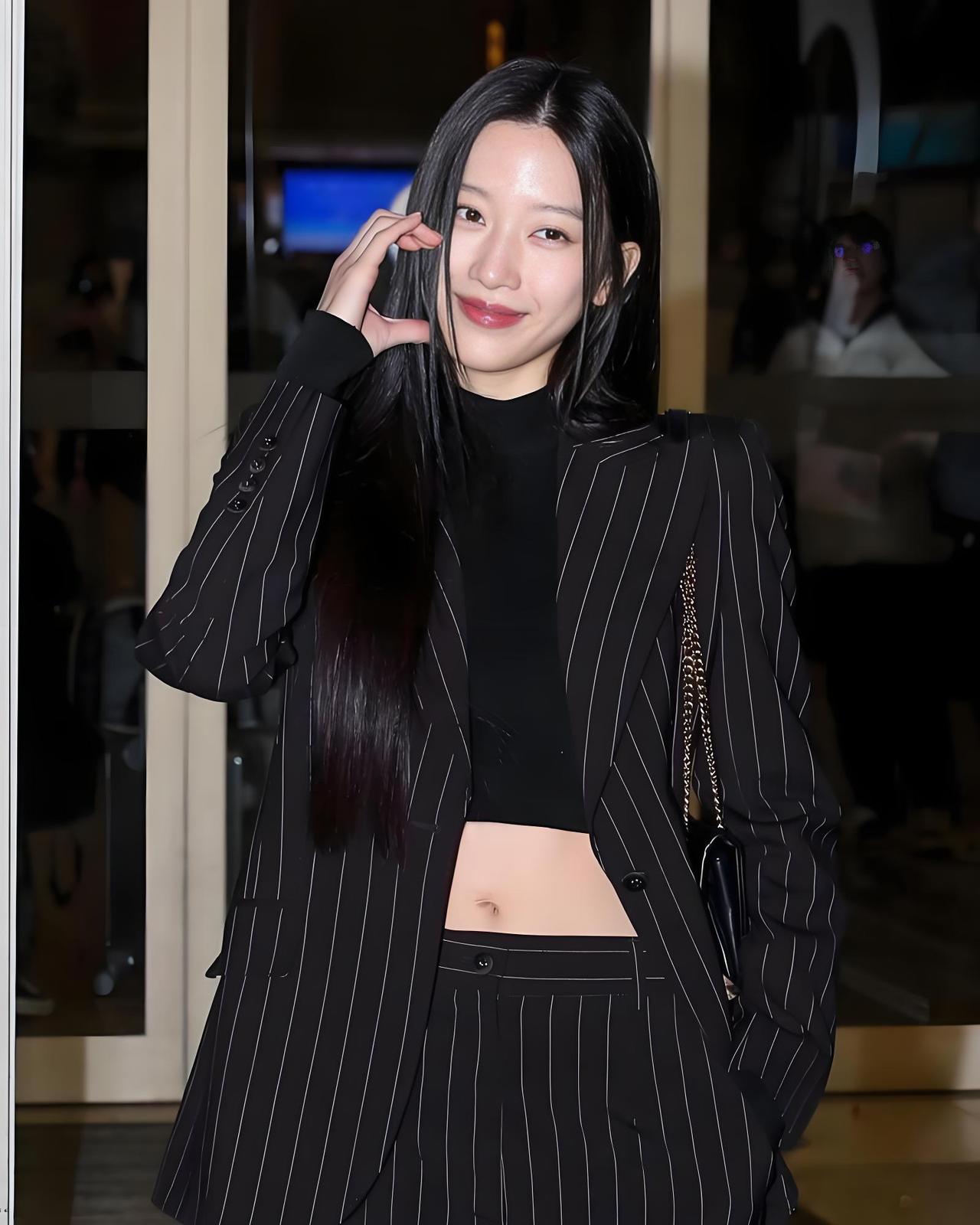 韩国美女模特文佳焕搭配黑色条纹西装,尽显魅力女神风范。