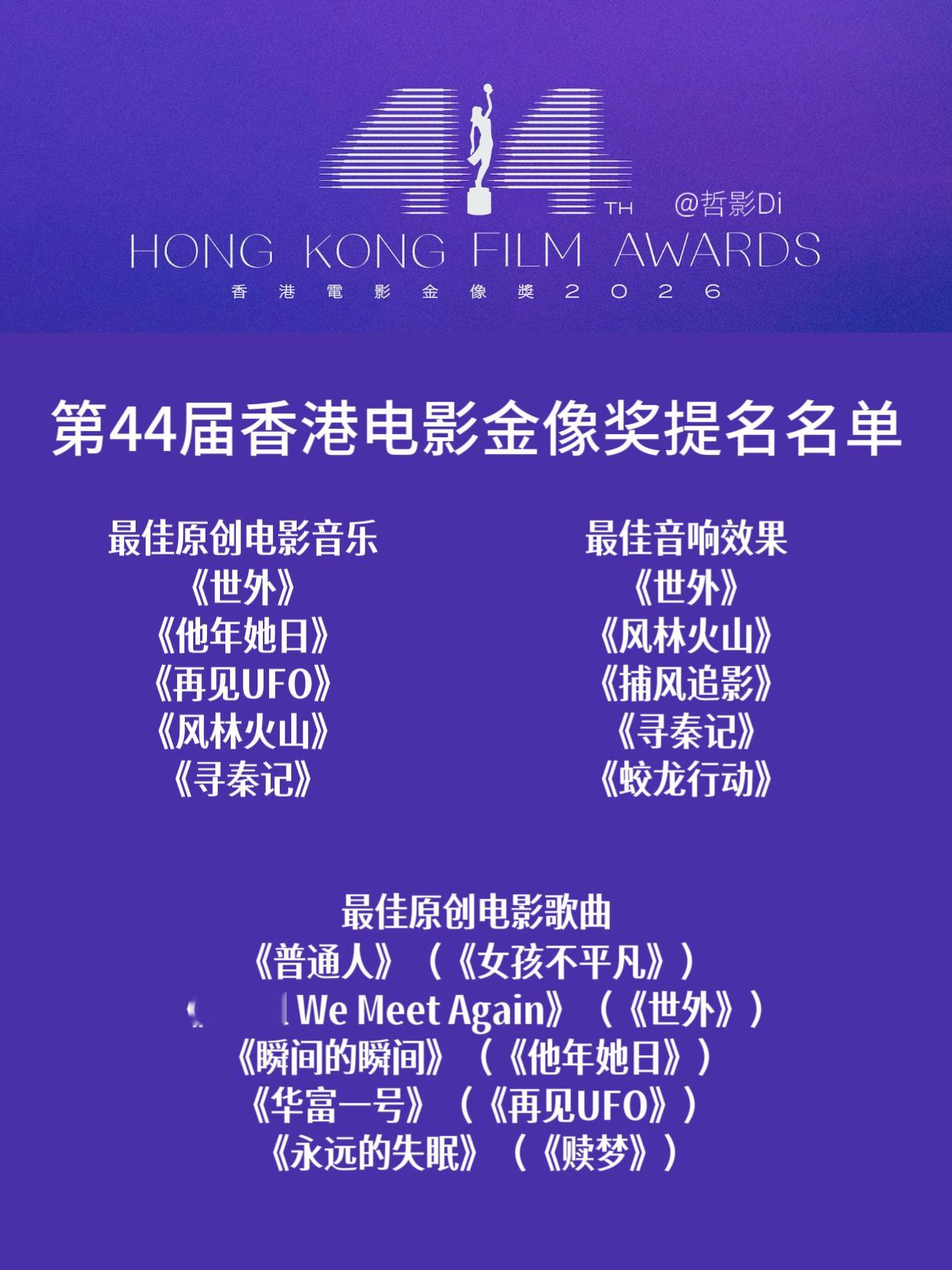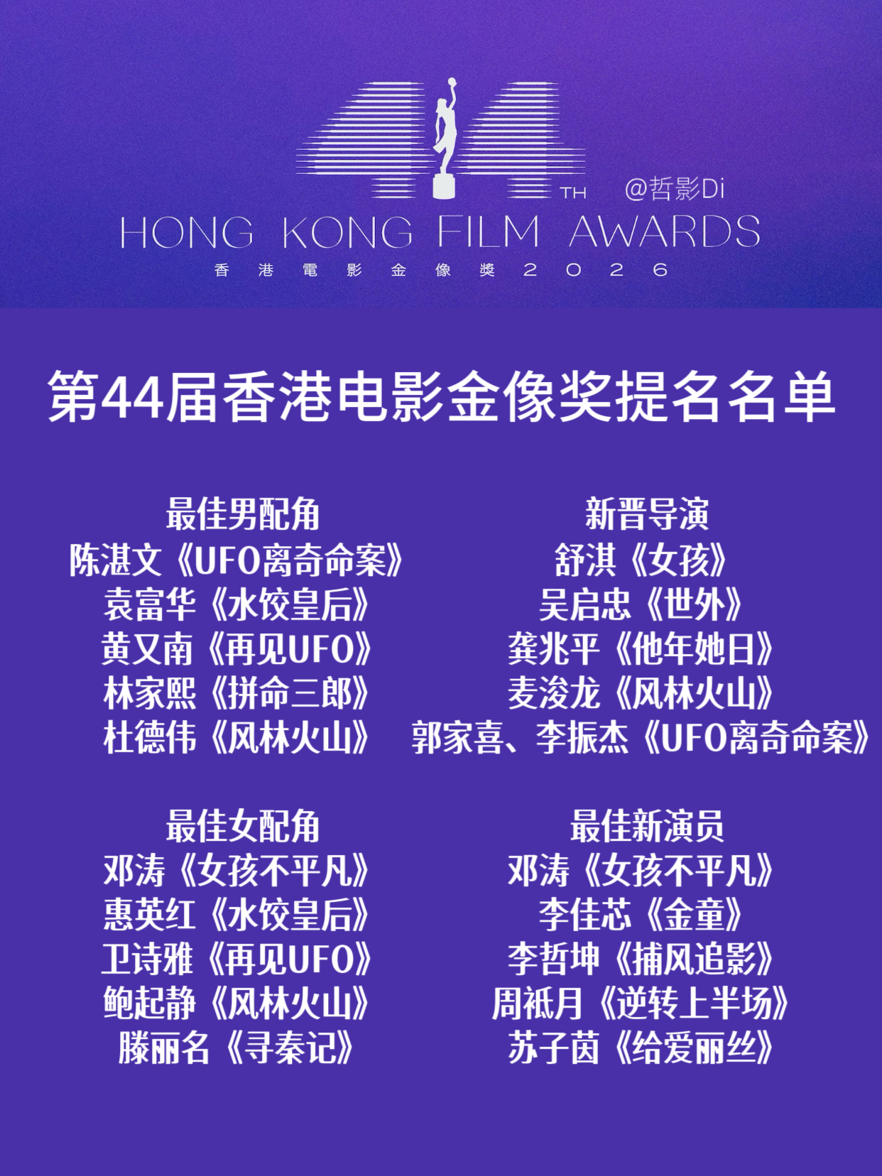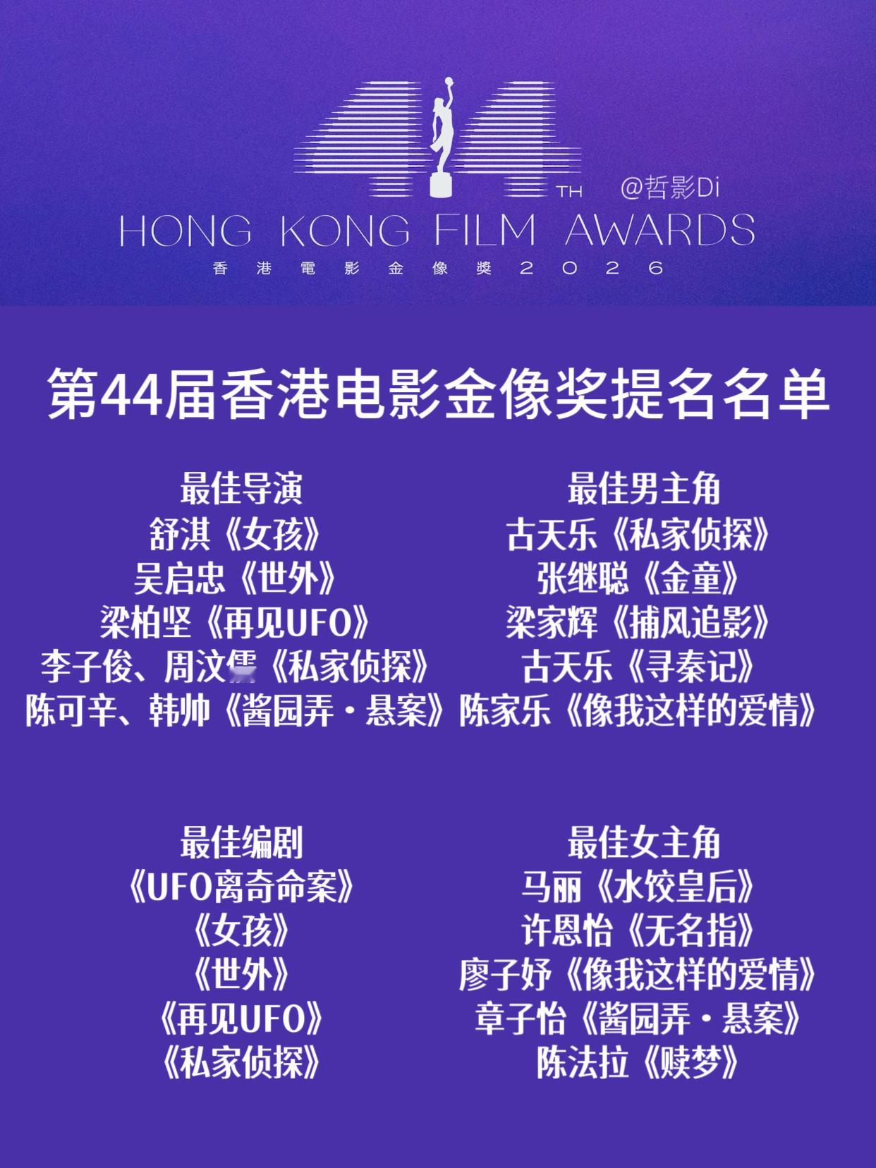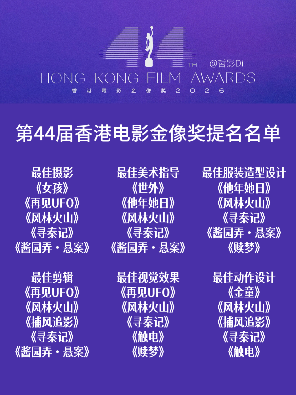 第44届香港电影金像奖提名公布,麦浚龙执导的新片《风林火山》获得12项提名领跑,《寻秦记》则以11项提名紧随其后,《再见UFO》获得10项提名跻身前三甲。舒淇凭借《女孩》获得最佳导演、新晋导演及最佳编剧三项提名,章子怡、马丽提名最佳女主角,竞争本届影后;古天乐则分别凭借《寻秦记》与《私家侦探》双提金像影帝。本届金像奖颁奖典礼将于4月19日举行。具体提名名单见下图