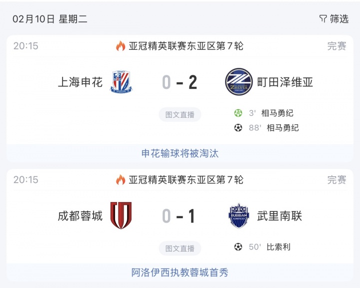 直播吧02月10日讯2026年亚冠首个比赛日,申花、蓉城双双输球。
