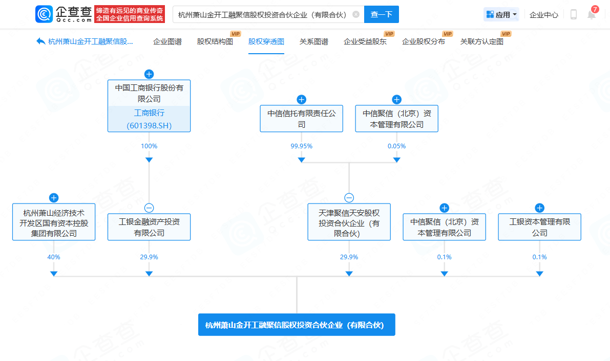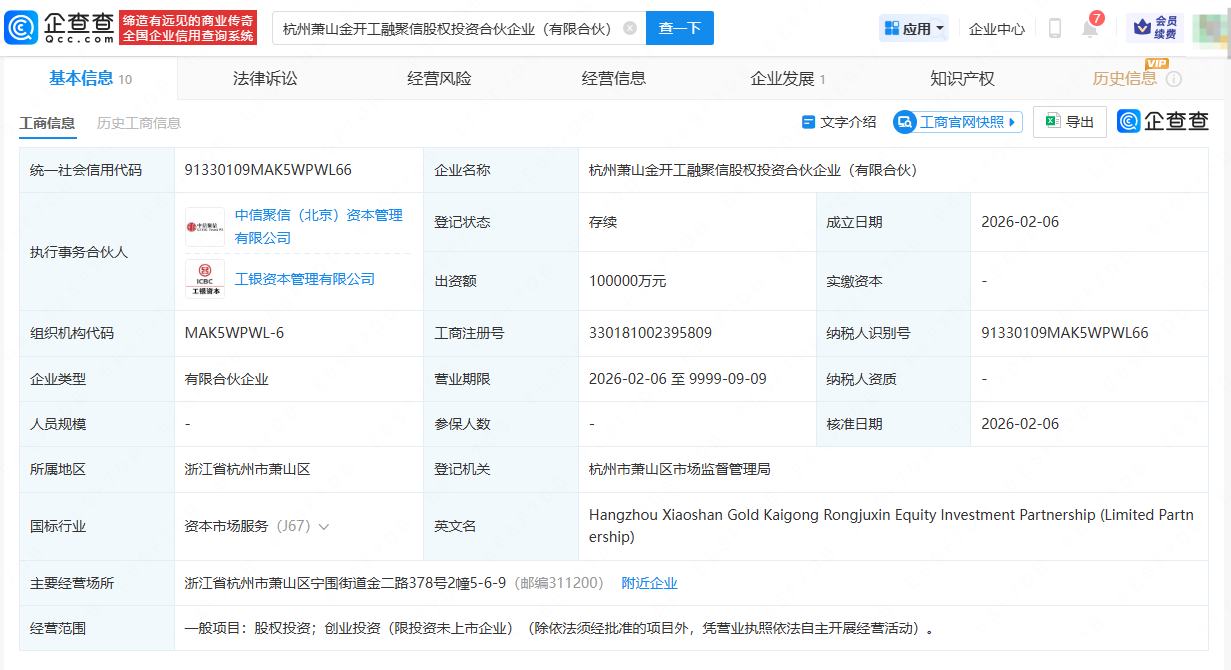 企查查APP显示,近日,杭州萧山金开工融聚信股权投资合伙企业(有限合伙)成立,出资额10亿人民币,经营范围为股权投资、创业投资。企查查信息显示,该企业由杭州萧山经济技术开发区国有资本控股集团有限公司、中信信托旗下天津聚信天安股权投资合伙企业(有限合伙)、工商银行(601398)旗下工银金融资产投资有限公司等共同出资。