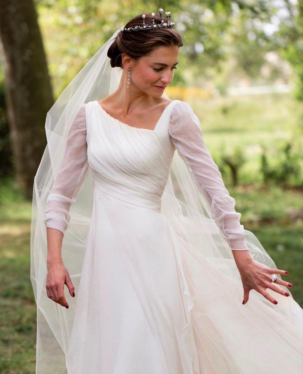 到处冲浪的时候见到个王冠造型挺有趣的新娘,她名叫Inés Baselga Barón,25年结的婚,即图3和4 搜索发现她应该有个亲姐,名叫Rocío Baselga Barón,她在2022年戴着同一顶王冠跟一个伯爵后裔结婚,即图1-2 她们应该都是西班牙塔马龙侯爵的后裔,更深层次资料为0,结婚时借用继承头衔亲戚的王冠 都说西班牙贵族婚礼带感,真没有瞎夸,总能从各路犄角旮旯人物的婚礼照片感受到 而细看姐妹俩的新娘王冠,其实长得有些怪异,5根棒棒的信号塔造型,顶端的珍珠还不怎么规整(图5)