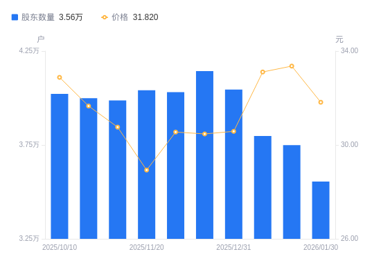 日期A股户数(户)流通A股户均持股数(股)户均持股市值(万元)2026-01-303555314759.0846.962026-01-203748713997.6446.702026-01-093797713817.0445.752025-12-314045312971.3439.672025-12-194143312664.5338.592025-11-284030913017.6839.772025-11-204041512983.5437.562025-11-103986713162.0040.492025-10-313999313120.5441.542025-10-104021613047.7342.90
