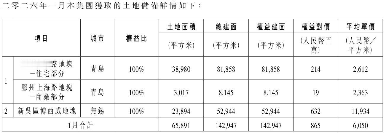 公告显示,龙湖1月新增两块土地储备,分别位于无锡和青岛,权益对价合计8.65亿元,权益比例均为100%。