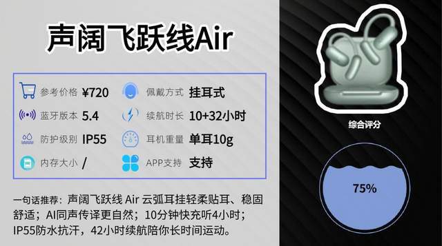 适合跑步、健身、徒步等轻中强度运动,IP55防水防尘,汗水或小雨无需担心。单次续航10小时,配合充电盒总续航42小时,快充10分钟即可使用4小时,足够覆盖长时间训练或外出运动。AI翻译功能适合出差或旅行场景,运动与多语言沟通兼顾。整体来看,声阔飞跃线Air兼顾舒适佩戴、长续航、防水性能与智能翻译功能,是运动与多场景应用结合的实用耳机。