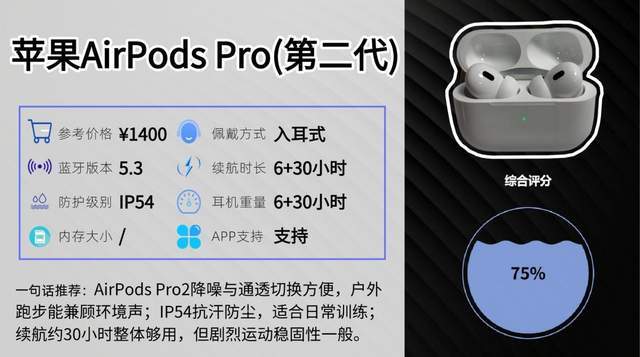 适合跑步、健身、散步等轻中度运动,IP54防尘抗汗,汗水或小雨不会影响使用。单次续航约6小时,搭配充电盒可达30小时,足够支撑一天训练和通勤需求。耳机稳定性高,运动中大幅度动作也不会轻易掉落,同时支持查找功能,防丢更安心。综合来看,AirPods Pro(第二代)以主动降噪、空间音频、舒适佩戴和良好续航为亮点,是兼顾音乐体验和日常轻中度运动的高端耳机选择。