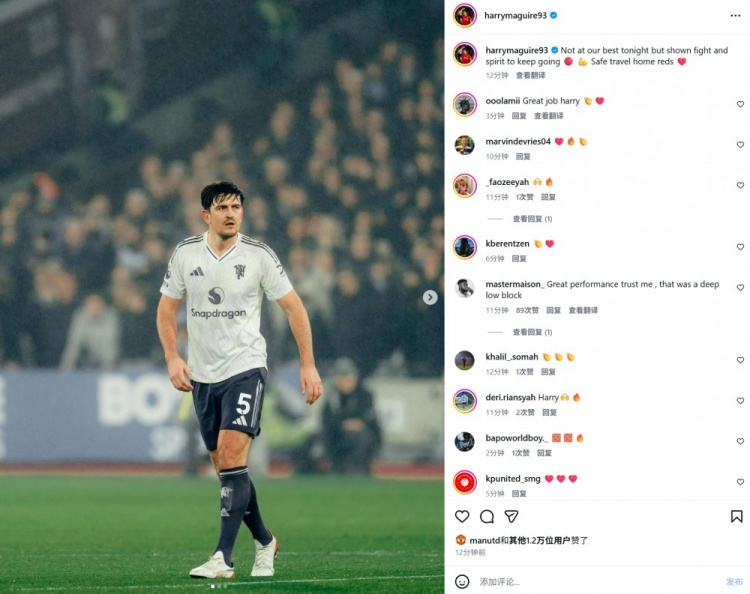 本场比赛马奎尔首发出场,赛后他在个人社媒晒出本场照片,配文写道:“今晚没有展现出我们最佳的状态,但球队依然拿出了拼搏的精神一直努力。球迷们归途顺利。”