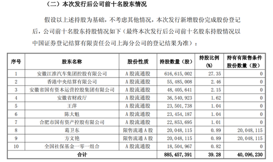 本次发行完成后,葛卫东将成为江淮汽车第八大股东,持股比例0.89%。