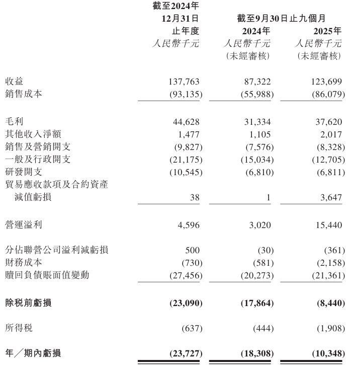 2024年及2025年截至9月30日止九个月,该公司年╱期内亏损分别为2372.7万元、1034.8万元人民币。