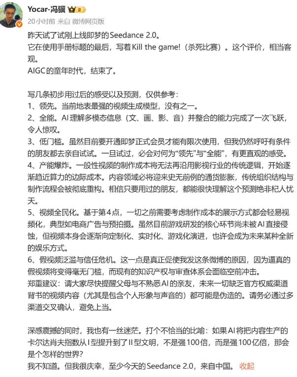 Seedance2.0火了,但一位特效老哥说:咱们得重新聊聊什么是‘真’了 刚刷到字节跳动那个Seedance2.0的消息,真是一声长叹。一位在后期特效公司干了快十年的朋友,半夜给我发了条消息,直接把聊天窗口炸了,他说:“这下好了,冯骥那句‘地表最强’算是把桌子彻底掀了。咱们这行,以后‘真实’俩字得打引号了。” 他说的不夸张。Seedance2.0这次内测展现的“文本/图片生成电影级视频”能力,在圈内人看来,已经不是什么简单的工具迭代。那份“真假难辨”的质感,在行业老手眼里,已经不是单纯的画面问题,而是一套全新的数字物理规则在跑通。光线的散射、材质的磨损、水花的溅射逻辑……这些过去需要庞大算力离线渲染数小时甚至数天的细节,现在被一个模型实时“理解”并生成出来。这感觉就像,你苦练多年武功,突然有人掏出了一本更高级的物理定律。 当然,从国产AI突破的角度看,必须得鼓掌。这标志着在顶级图形生成算法上,我们不再是追赶者,而是一脚踹开了前沿的大门,拿到了制定部分游戏规则的资格。这种跨越,值得所有技术从业者骄傲。 但那位朋友紧接着又发来一句,让我愣了半天。他说:“高兴归高兴,可我后背有点发凉。公司马上暂停了真人素材内测,这反应够快,也说明他们自己都知道‘水’有多深。”他点了根“烟”的表情,继续说:“你想,过去我们说深度伪造(Deepfake),那多少还有点‘CG感’,行家一眼能看出破绽。以后呢?当这种级别的模型流出或被滥用,‘有图有真相’就成了最脆弱的笑话。伪造一段‘证据’的成本和门槛会低到可怕,打官司、搞舆论,甚至国际政治,怎么玩?” 这话点透了Seedance2.0火爆表象下的真正命题:它逼着我们所有人,必须立刻“重估虚拟现实”。虚拟现实不再仅仅是那个需要戴头盔的沉浸空间,它正变成一种无声无息、弥漫在每一块屏幕上的认知渗透。当AI生成的影像在物理质感上完全匹敌甚至超越实拍时,我们所依赖的视觉真实性基石就开始松动了。 这已经超出了技术讨论范畴,变成了一场关于信任和认知的社会挑战。未来的赛博世界,虚拟与现实必然是深度交织的。我们不能因噎废食,反对技术进步,但规则和护栏的建设,必须跑在技术普及的前面。作为技术的引领者,中国公司除了刷新性能榜单,更需要在数字水印、内容溯源、反伪造检测这些“安全基建”上投入同等甚至更大的力量。同时,我们也得开始培养一种新的公众素养——对所有影像内容,保持一份合理的“数字怀疑主义”。 现在再看到那些以假乱真的视频,我总会下意识地多看一眼角落,心里默念:这到底是现实的影子,还是某个算法的意图?这场关于“真实”定义的漫长竞赛,Seedance2.0只是吹响了最嘹亮的那声开场哨。