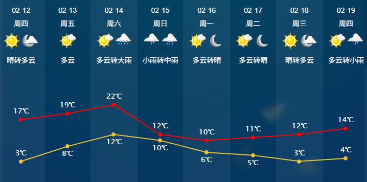 明天晴转多云,气温3~17℃,最低气温比今天偏低1℃左右。周五(13日)起暖湿气流再度活跃,白天云系增多转多云到阴,夜里起阴有小雨。降水主要出现在周五夜间到周日。气温先升后降,周五最高气温升至19℃左右,周六(2月14日)最高气温更是突破两位数,直冲22℃。