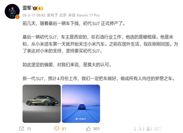 小米创始人雷军宣布:初代SU7正式停产,最后一台交付给一位从海外归国的忠实米粉,其坚定支持令团队深受鼓舞。