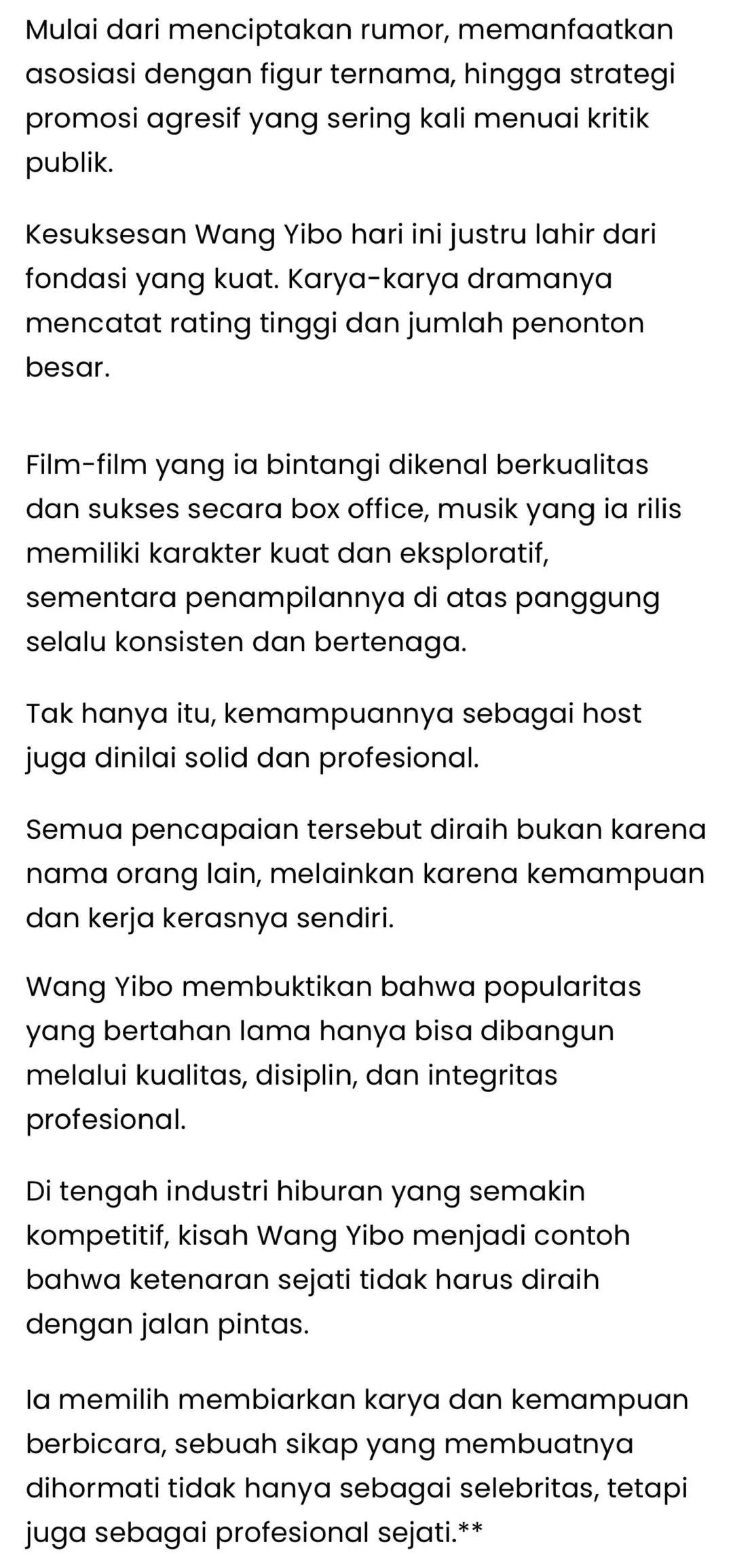印尼媒体报道写得透彻:王一博登顶之路,五年不靠炒作,靠自身实力。[赞] 海外媒体非常了解在当下娱乐圈的不良风气,太多人急功近利走捷径,用捆绑炒作、蹭热度、买水军营销等手段来打造“红”的假象。 而王一博则是珍贵的一股清流,他不抢他人风头、不炒作,谦逊自律,只用实力和作品说话。他的故事成为范本!