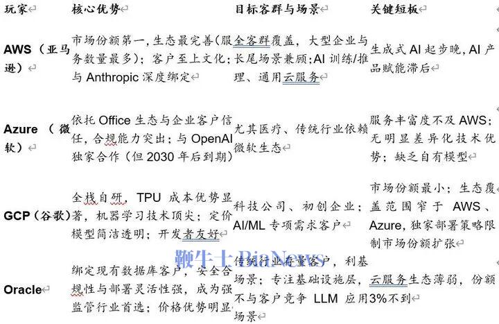 亚马逊AWS作为全球云市场份额第一的玩家,拥有最完善的生态和客户至上的文化,且与Anthropic深度绑定(股权+芯片定制+基础设施支持)。