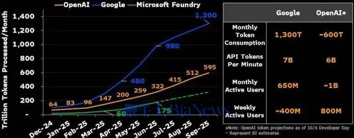 图:谷歌tokens调用大幅领先于OpenAI