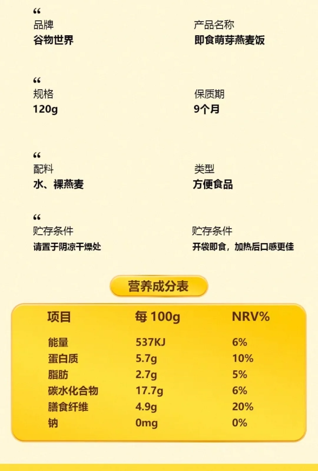 • 每袋(120g)是纯萌芽燕麦:GI值才52(低GI认证),比白米饭升糖慢太多!