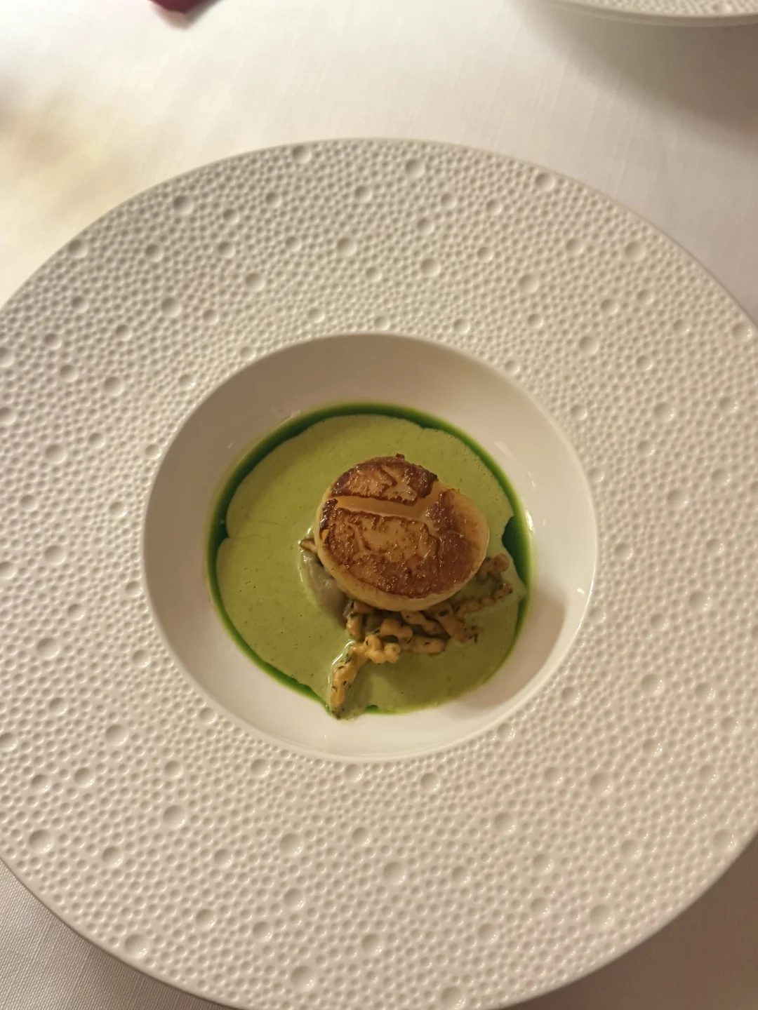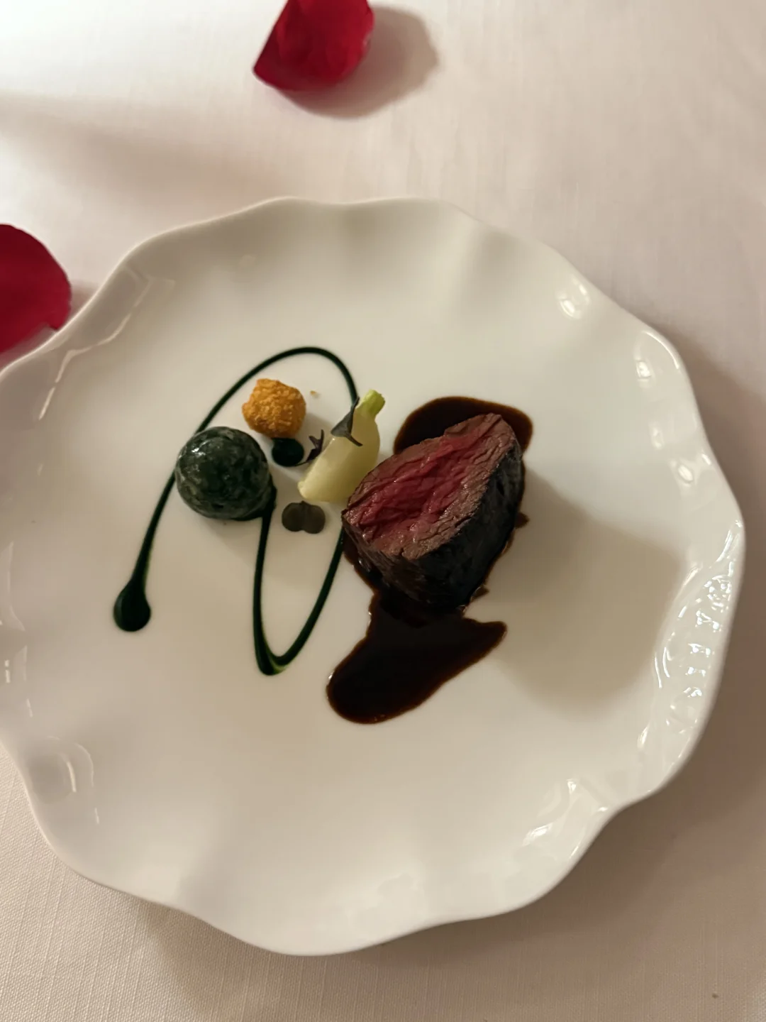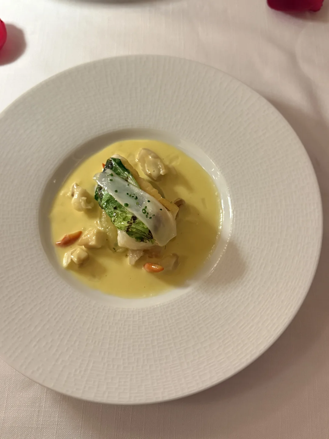 🖤两道海鲜主菜堪称惊艳—— 「秩板煎扇贝」 火候精准,焦糖化边缘锁住了贝柱的鲜甜; 「油封黑鲻鱼」 则诠释了法餐的细腻,鱼肉如蒜瓣般片片分明,浸润着橄榄油与香草的芬芳。
