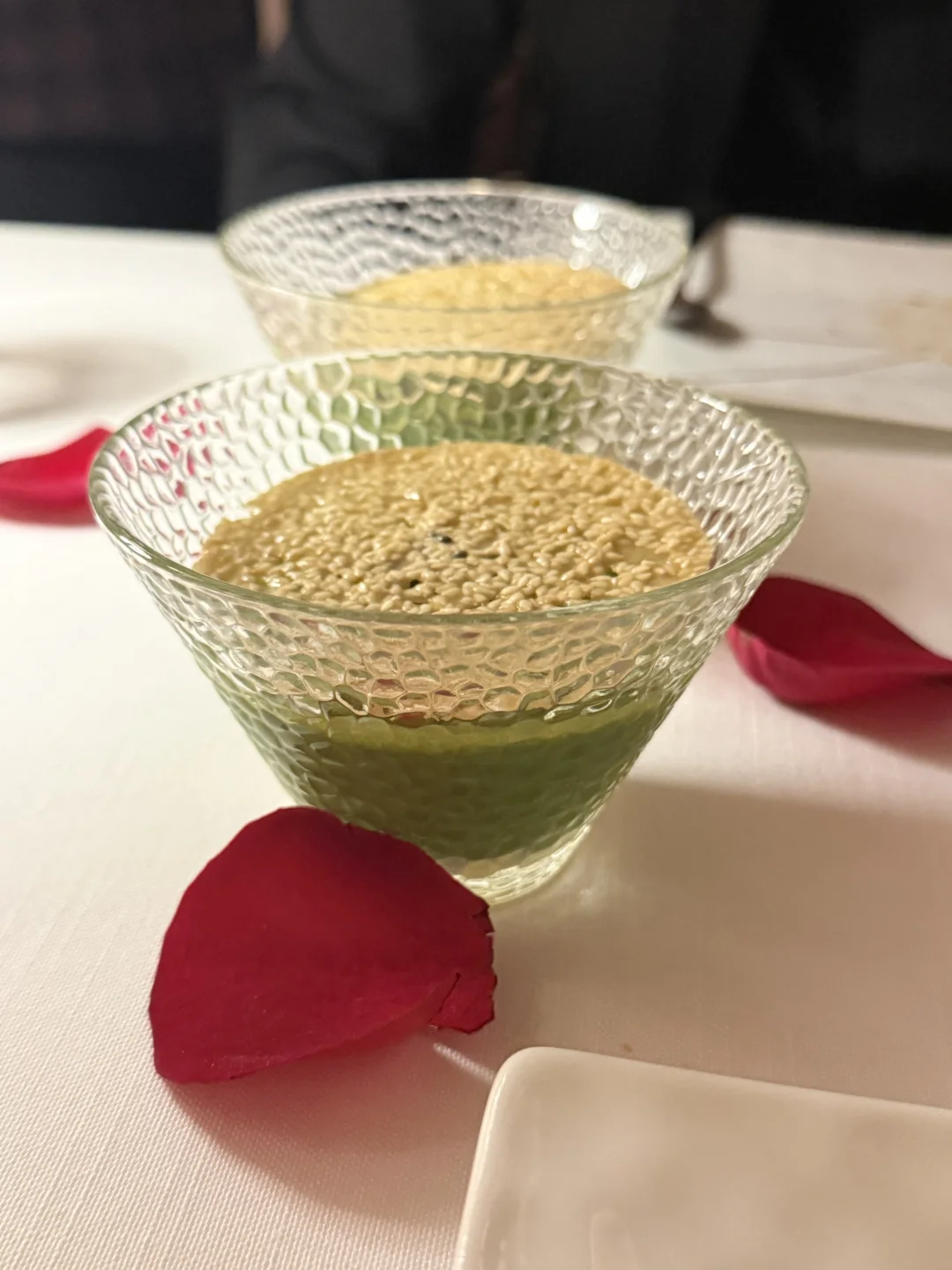 🖤收尾的 「歌剧院蛋糕」 与 「冰抹茶」 是经典与禅意的碰撞。榛子巧克力的浓郁,被一抹清苦的茶香和芝麻香气温柔化解,为今晚画上圆满句号。