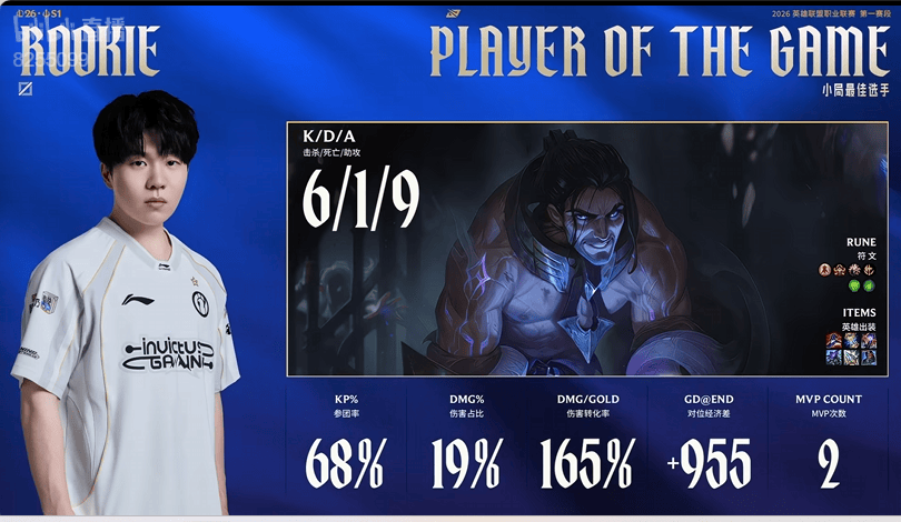 Rookie塞拉斯打出6/1/9战绩,拿到IG对阵OMG首局比赛MVP