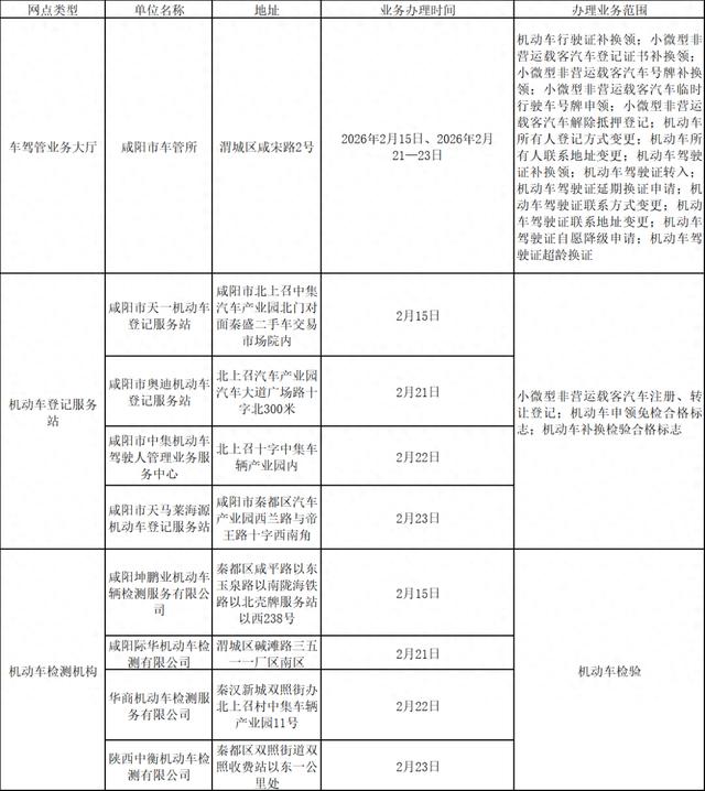 为满足群众春节期间办理车驾管业务需求,咸阳市公安局交通警察支队车管所春节期间实行线下窗口留人值守+线上24小时不打烊模式,保障返乡、出行群众高频次车驾管业务正常办理,可办理机动车补换牌证、驾驶证补换证及小微型非营运载客汽车登记、机动车检验等业务。现将有关情况通告如下: