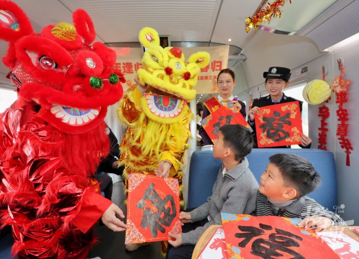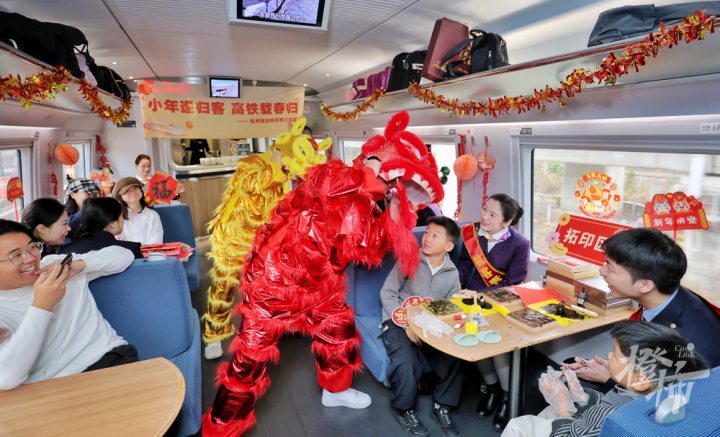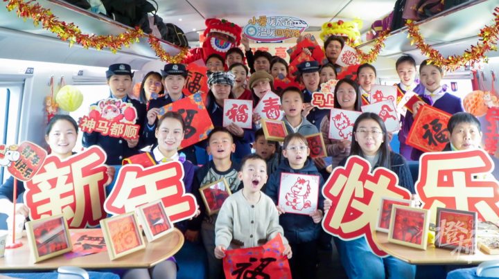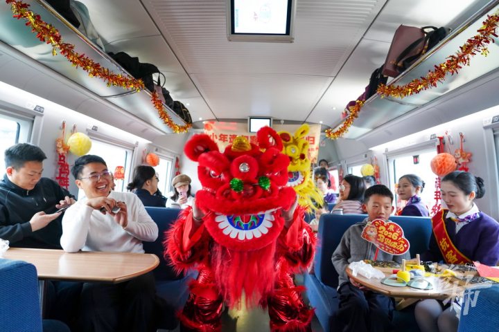 飞驰的列车变身温馨的年味驿站,旅客们在旅途中沉浸式体验非遗手作、观赏文艺表演,共迎新春佳节。