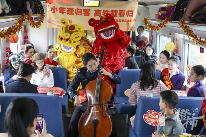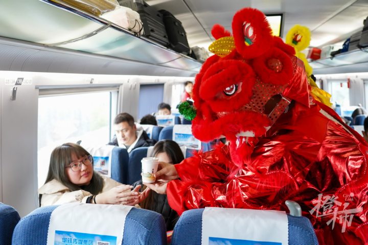 将车厢气氛推向高潮的,当属《舞狮踏春》表演,伴着铿锵有力的锣鼓点,红金两只瑞狮踏乐登场,在车厢过道间灵动辗转,裹挟着浓浓的新春暖意。