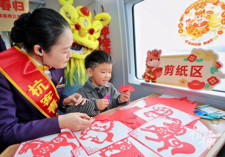 “这是我第一次在高铁上过小年,还能亲手做剪纸,感觉特别有意义。”来自郑州的旅客李女士笑着说。