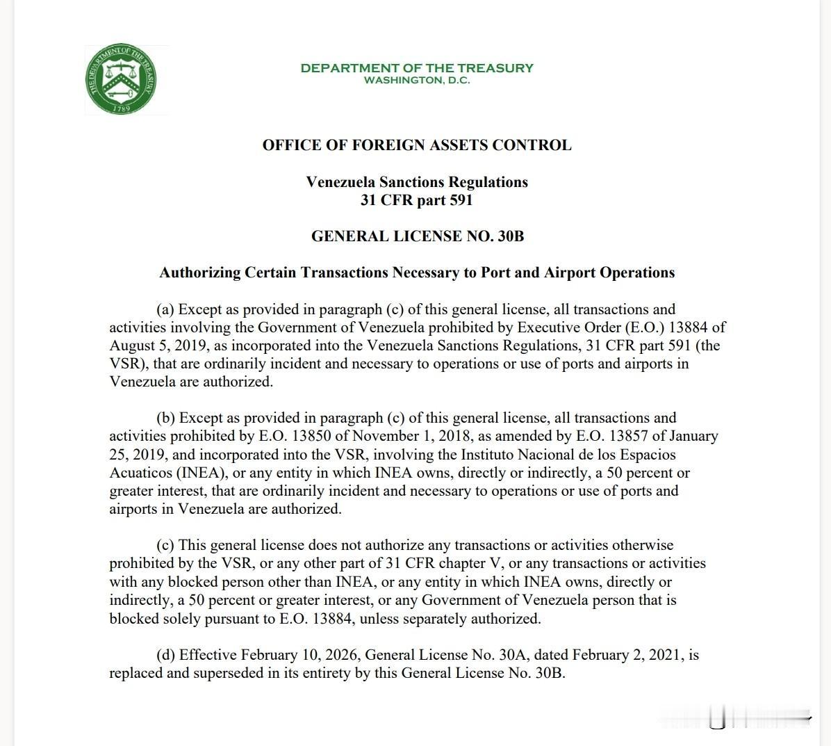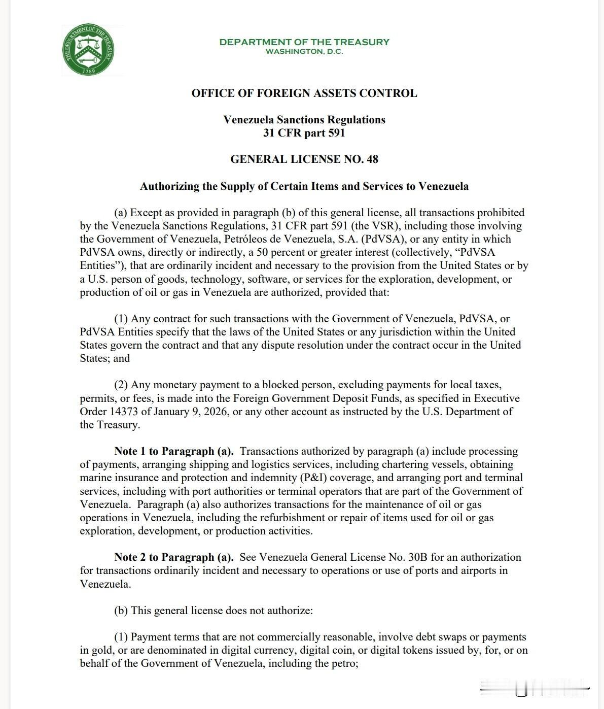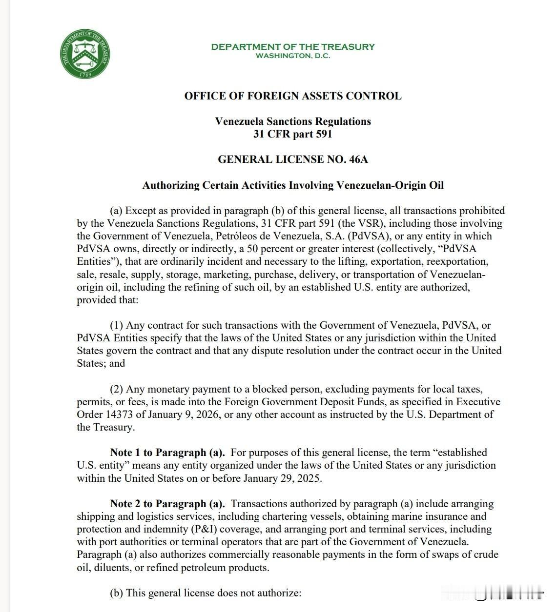 美国对委内瑞拉石油运营下铁令:禁止任何涉及俄罗斯的交易 洲哥讲时事 当地时间2026年2月11日,美国财政部外国资产控制办公室颁发一项新的委内瑞拉石油业务许可证,该许可证允许实施“与委内瑞拉石油相关的某些活动”。 但其中最引人注目的条款专门描述了不允许的交易:“涉及位于俄罗斯联邦境内或根据俄罗斯联邦法律设立的个人(包括法人)的任何交易。同样的禁令也适用于另外三个国家——伊朗、朝鲜和古巴。 另一条款禁止任何涉及位于委内瑞拉或美国(或依其法律设立)的法人实体之间,由位于中国的人“直接或间接拥有”或控制的交易。 美国财政部外国资产控制办公室颁发的针对委内瑞拉许可证共三项:“授权向委内瑞拉供应某些物品和服务”;“授权港口和机场运营所需的某些交易”;“授权涉及委内瑞拉原产石油的某些活动。” 国际新闻实时报道:敬请关注今日头条号《智慧转身》 俄乌战争战场剖析:敬请关注抖音《洲哥讲时事》视频更精彩。 中国传统文化弘扬与传播,敬请关注《洲瑜国学讲堂》
