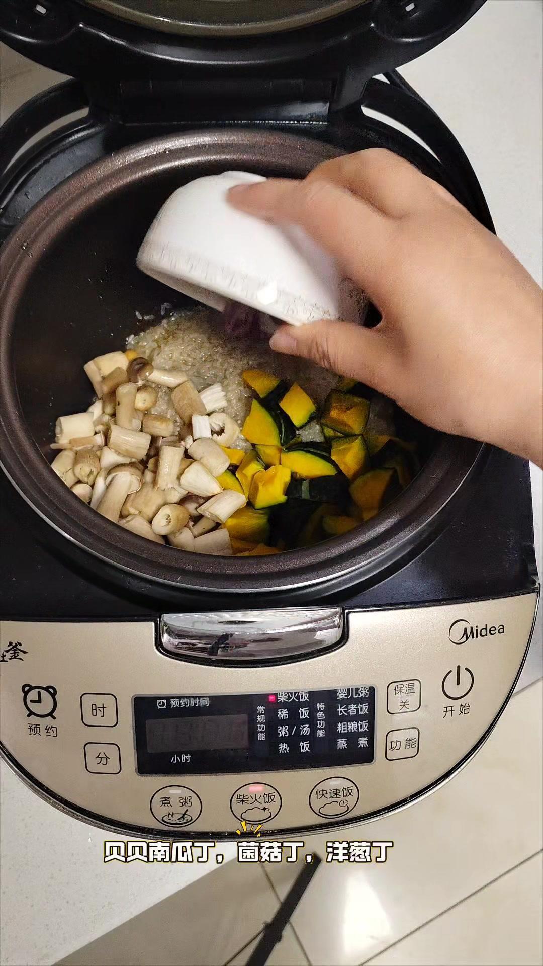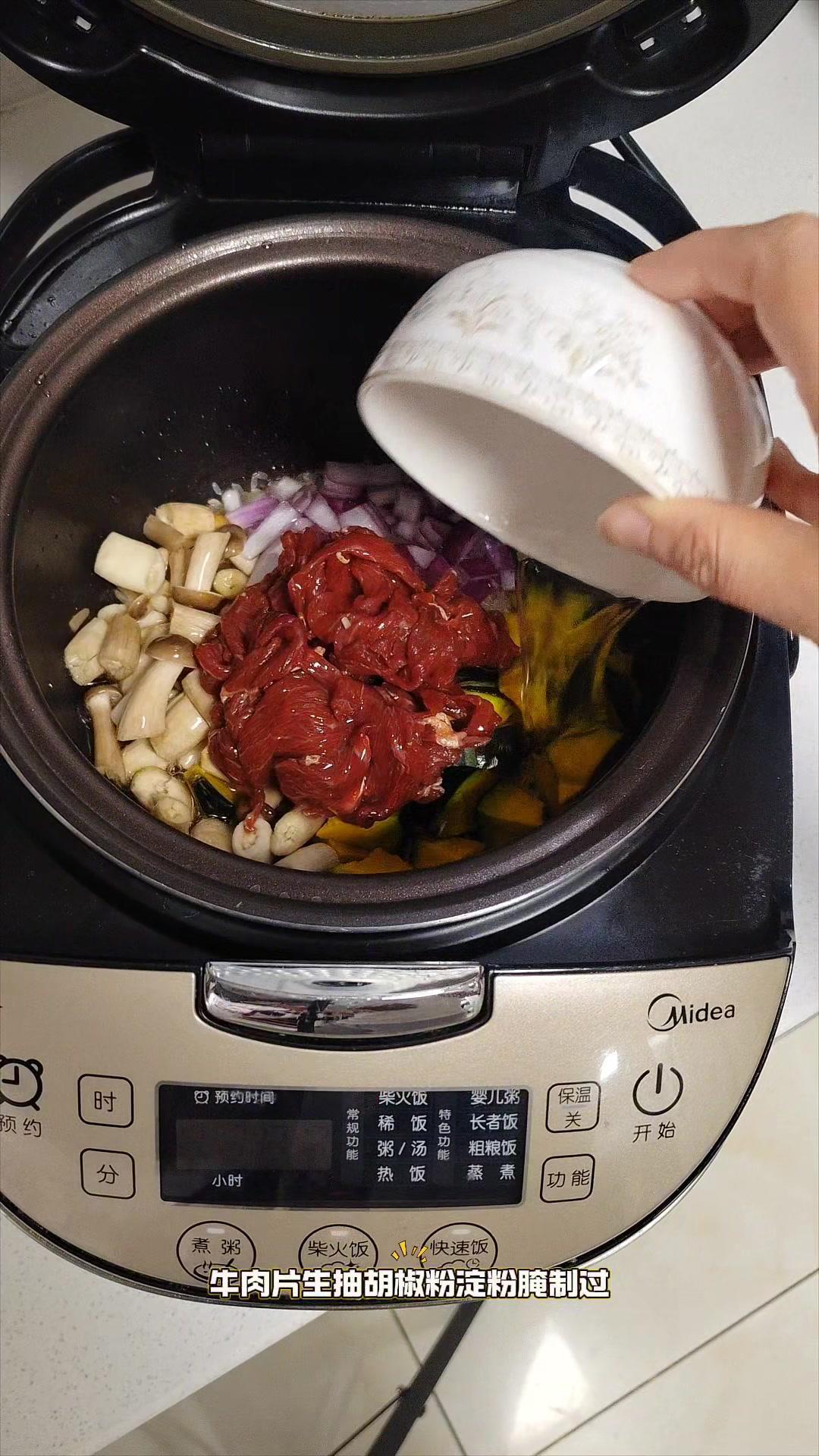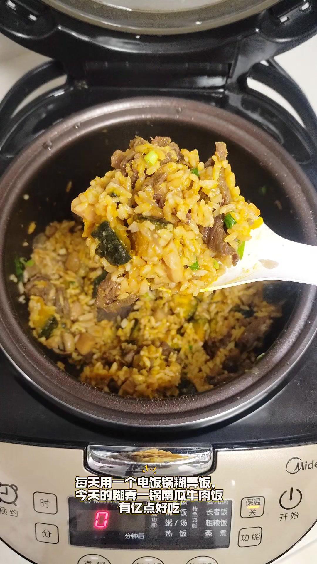 1️⃣把大米淘洗干净,加油、生抽和盐拌匀。 2️⃣准备贝贝南瓜丁、菌菇丁和洋葱丁,牛肉片提前用生抽、胡椒粉和淀粉腌制好。 3️⃣把这些食材全部放进电饭锅,加半碗水,按煮饭键。 4️⃣煮好后撒上葱花,用勺子拌匀,香糯好吃的南瓜牛肉焖饭就完成了。 低卡顶饱又营养,打工人和学生党快试试!