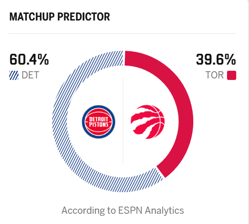 ESPN预测明日比赛:活塞胜率60.4%,猛龙胜率39.6%