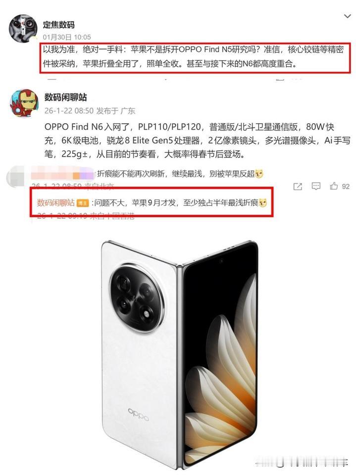 2026年了!苹果现在才做折叠屏是为啥? 之前各大手机厂商卷折叠屏的时候,苹果无动于衷,为什么今年突然就要发布折叠屏了?现在网上主流的说法是,目前折叠屏技术已经成熟,达到苹果的要求了,所以苹果才选择现在入局,大家觉得这个说法靠谱吗? - 有一说一,这个说法跟目前已有的爆料还真对的上!iPhone Fold据传重点在于折痕优化,誓要做最浅折痕折叠屏,为此还买了OPPO Find N5回去研究,后面曝光要全盘套用OPPO Find N6的供应链技术,照着答案抄了属于是,友商技术成熟了,苹果拿过来就用。 - 目前来看,OPPO Find N6会用上新的黑科技,包括黑绷带屏幕、液态金属铰链、自修复玻璃等。“黑绷带屏幕”技术据说能实现视觉无折痕的效果,液态金属铰链则能尽可能减少弯折对屏幕的影响,自修复玻璃顾名思义,让屏幕拥有自修复能力,三者结合不仅做到最浅折痕,还能自修复,确实离谱! - 而且Find N6大概率3月份发布,比苹果至少早半年,技术相同、更早发布,苹果折叠屏据说要2w,价格上OPPO也大概率比苹果便宜不少。这样综合来看,想体验下一代折叠屏的,等3月份OPPO不是更合适吗? OPPO趁现在 苹果折叠屏 iPhoneFold OPPO OPPOFindN6 折叠屏 数码科技 数码圈八卦 数码新鲜事