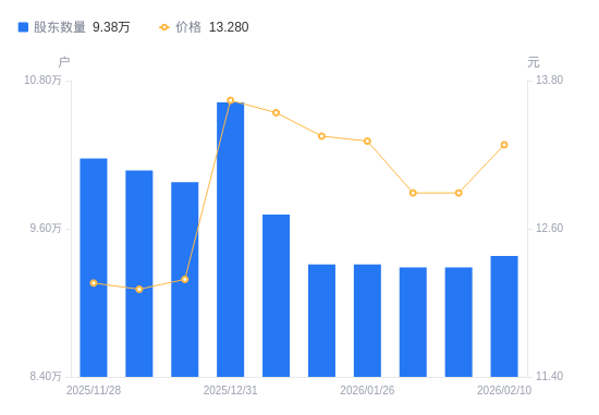 日期A股户数(户)流通A股户均持股数(股)户均持股市值(万元)2026-02-109380126461.7035.142026-01-319287526725.5334.452026-01-309287526725.5334.452026-01-269310626659.2235.482026-01-209310626659.2235.592026-01-099714125551.8634.602025-12-3110624323362.8031.872025-12-199977624877.0630.332025-12-1010072124643.6629.842025-11-2810168124410.9929.68