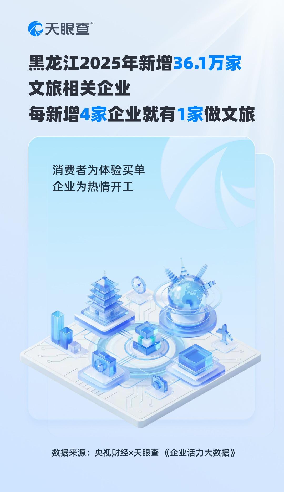 黑龙江每4家新企业就有1家做文旅 全国文旅企业超259万家 眼下,正值哈尔滨冰雪旅游火爆“出圈”的第三个冰雪季,一系列新玩法令人眼前一亮。近年来,黑龙江努力推动冰雪经济全产业链发展,构建起集智能化装备、沉浸式体验、大数据运维等于一体的现代产业体系。数据显示,2024至2025冰雪季,黑龙江冰雪经济总产出2661.7亿元,冰雪经济正在成为拉动全省经济增长的新引擎。 天眼查数据显示,2025年仅文体娱乐、租赁和商务服务、住宿和餐饮四大领域,黑龙江就新增36.1万家企业,占全省所有新增企业的1/4,即每新增4家企业,就有1家与文旅产业相关。从"网红打卡"到"长红产业",消费者愿意为优质体验买单,企业便顺势而为,这就是市场的力量。