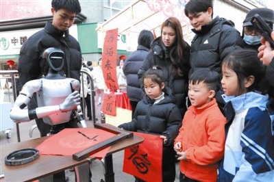 庙会现场,传统与科技也碰撞出别样年味。“福气使者”智能机器人亮相街头,机械臂挥毫泼墨,一笔一画书写福字,以科技笔墨传递新春祝福,引得大小朋友围观点赞。“太热闹了,带小朋友在这逛了一下午,提前感受年味儿。”市民黄女士说,看演出的同时,买新年衣服和年货,方便又开心。