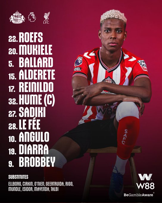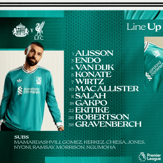 利物浦首发:1-阿利松、3-远藤航、4-范戴克、5-科纳特、26-罗伯逊、38-赫拉芬贝赫,10-麦卡利斯特、7-维尔茨、11-萨拉赫、18-加克波、22-埃基蒂克