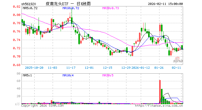 2月11日,疫苗龙头ETF(561920)跌0.42%,成交额109.11万元。当日份额减少100.00万份,最新份额为5969.20万份,近20个交易日份额增加2900.00万份。最新资产净值计算值为4285.89万元。