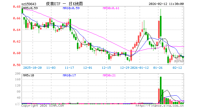 2月12日,截止午间收盘,疫苗ETF(159643)跌0.51%,报0.591元,成交额326.88万元。疫苗ETF(159643)重仓股方面,复星医药截止午盘跌1.14%,长春高新跌0.52%,智飞生物跌0.64%,沃森生物跌0.49%,万泰生物跌0.97%,华兰生物跌0.32%,昭衍新药涨1.86%,丽珠集团跌0.62%,辽宁成大跌0.17%,康泰生物跌0.98%。