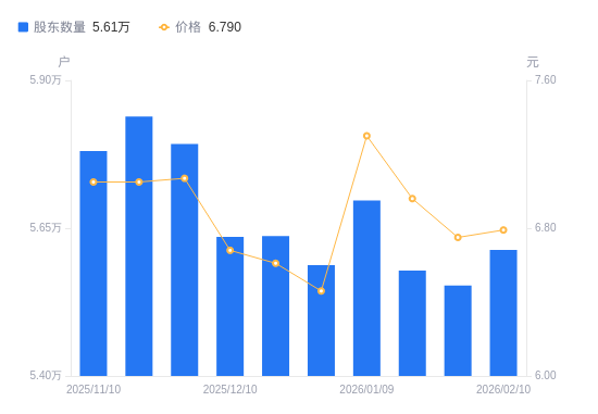 日期A股户数(户)流通A股户均持股数(股)户均持股市值(万元)2026-02-105613225639.2517.412026-01-305552925917.6717.492026-01-205578525798.7417.962026-01-095697025262.1118.442025-12-315587325758.1016.642025-12-195636625532.8116.882025-12-105635325538.7017.062025-11-285792424846.0517.572025-11-205839124647.3417.382025-11-105780524897.2017.55