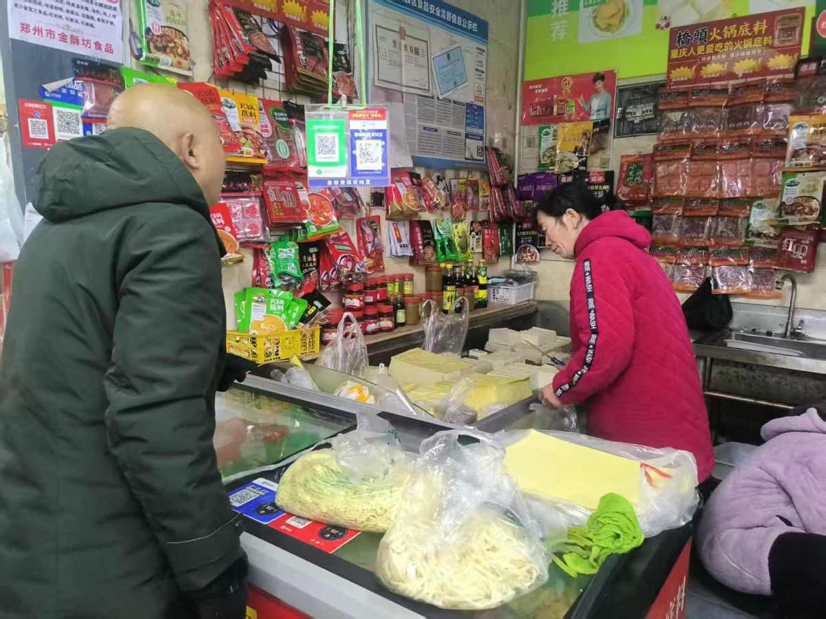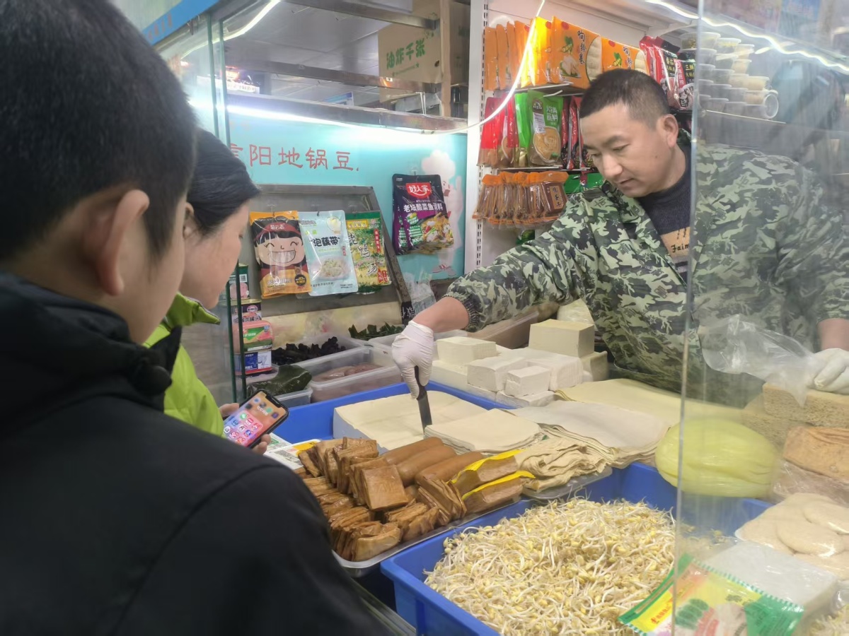 在北大街四方集市,专营豆制品的老板正忙着给顾客装袋:“今天人少,没有前几天人多,有不少人前几天就开始炸货,这几天千张、豆皮、豆筋卖得还不错。”他指了指摊前一位刚扫码付款的市民:“你看看人家这袋子里,豆腐、豆皮、豆筋,齐了,回家一冻,吃火锅啥都有了。”