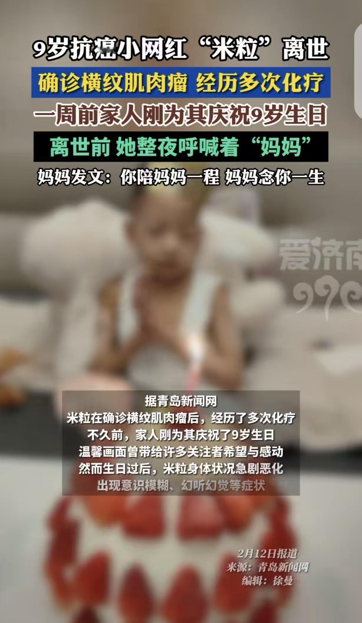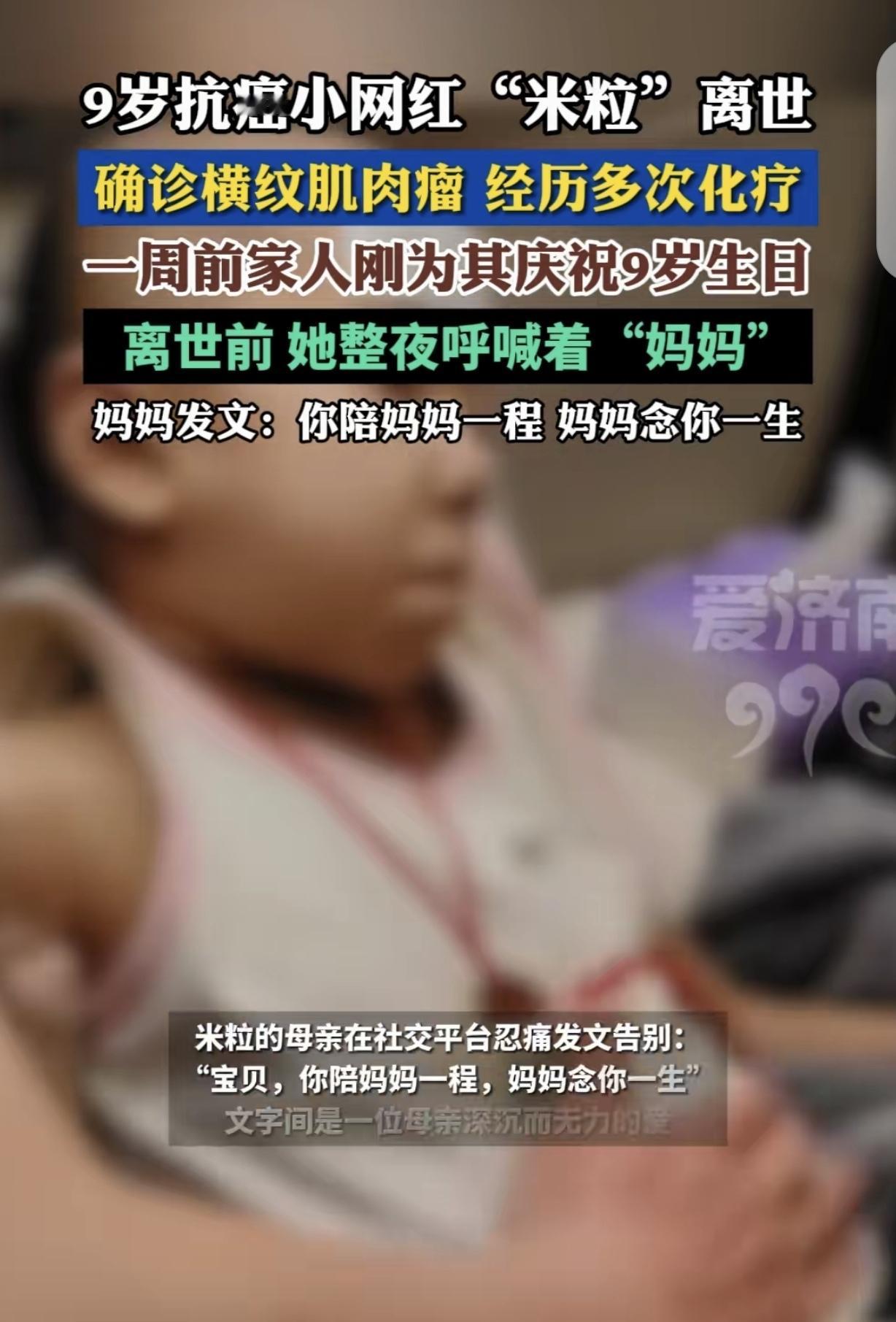 “心疼哭了!”山西太原,一9岁女孩不幸确诊横纹肌肉瘤,妈妈把头发剃光,陪着女儿化疗,可跟病魔抗争1年多,女孩撑不住了,她去世前,被折磨的出现幻听幻觉,虚弱地问妈妈:“你还是以前的那个妈妈吗?”,她临去世前,整夜呼喊妈妈,临终前说了句话,让人听了心碎。女孩妈妈:宝贝,你陪妈妈一程,妈妈念你一生。 生命的最后旅程,爱与痛的交织 9岁的小女孩米粒突然被命运狠狠击中,确诊了横纹肌肉瘤。 这个消息如同一颗重磅炸弹,瞬间把这个家炸得支离破碎。 从确诊的那一刻起,米粒小小年纪就开始了与病魔的艰难抗争。 化疗的日子痛苦又漫长,每一次治疗都像是一场酷刑。 可这个小天使,展现出了远超她年龄的坚强和勇敢。她紧紧咬着嘴唇,哪怕疼得眼泪在眼眶里直打转,也强忍着不哭出声来。 她知道,妈妈在旁边看着她,她不想让妈妈更心疼。 妈妈看着女儿遭受这样的折磨,心都碎了。 她毅然决然地剃光了自己的头发,陪着女儿一起面对这残酷的现实。 她日夜守在女儿身边,握着女儿的小手,给她鼓励,给她力量。 然而,病魔实在是太强大、太无情了。跟它抗争了一年多,米粒的身体越来越虚弱,精神也越来越恍惚。 她开始出现幻听幻觉,常常惊恐地睁大眼睛,四处张望,仿佛看到了什么可怕的东西。 有一次,她虚弱地问妈妈:“你还是以前的那个妈妈吗?”妈妈泪如雨下,紧紧地把女儿抱在怀里,说:“宝贝,妈妈永远都是那个爱你的妈妈。” 可经过一年的化疗,米粒还是走到生命的最后时刻,她在家人的祝福声中,刚过完9岁生日,病情就急转直下。 临去世前,她整夜都在喊妈妈。那气若游丝却又恋恋不舍的声音,就像一把把利刃,刺痛着妈妈的心。 妈妈守在女儿的床边,一刻也不敢合眼,她多希望能用自己的生命换回女儿的健康。 可那个让人心碎的时刻还是来了。米粒在临终前,用尽最后的力气,对妈妈说:“妈妈,我好舍不得你,我要去世了……” 话还没说完,她的小手就无力地垂了下去,眼睛也慢慢闭上了。 妈妈发出一声撕心裂肺的哭喊,整个人瘫倒在地上。她紧紧地抱着女儿已经渐渐冰冷的身体,仿佛这样就能把女儿留住。 “宝贝,你陪妈妈一程,妈妈念你一生。”妈妈发文悼念女儿,字字泣血。 妈妈多希望这只是一场噩梦,醒来后女儿还能像以前一样,蹦蹦跳跳地扑进她的怀里,甜甜地喊她妈妈。 这个9岁的小女孩,用她的坚强和勇敢,诠释了生命的顽强;她对妈妈的不舍。 而妈妈的悲痛和心碎,也让我们看到了母爱的伟大。愿小女孩在天堂没有病痛,愿妈妈能慢慢走出悲痛,带着对女儿的爱,坚强地生活下去。 有人说,好扎心啊,米粒,一路走好。愿天堂没有病痛,谁能受得了这样的离别,心疼一辈子的感受!以前没感觉,现在有孩子了,好难受。 大家不要难过,她只是去了另一个世界。天堂对癌症患者也许是最好的归属,虽说可惜,但对于每天都要面对痛苦却不敢说,怕家人担心,怕说了也没用,愿世间再无病痛。 人间难受的是爱,最难受的是你爱的人,母亲在伟大也没招啊,只能默默看着她离去,原她在天堂没有悲伤,有得开心快乐人间美。 经历病痛折磨却还是这么早离开了,真希望有针对癌症的特效治疗,不要让人饱受折磨却还是治疗无效。 孩子失去父母痛一阵子,父母失去子女痛一辈子,这样迥异的痛惜,就是人心向下的惯性,世间多见不孝子,却罕见不慈母…… 对此,你怎么看?