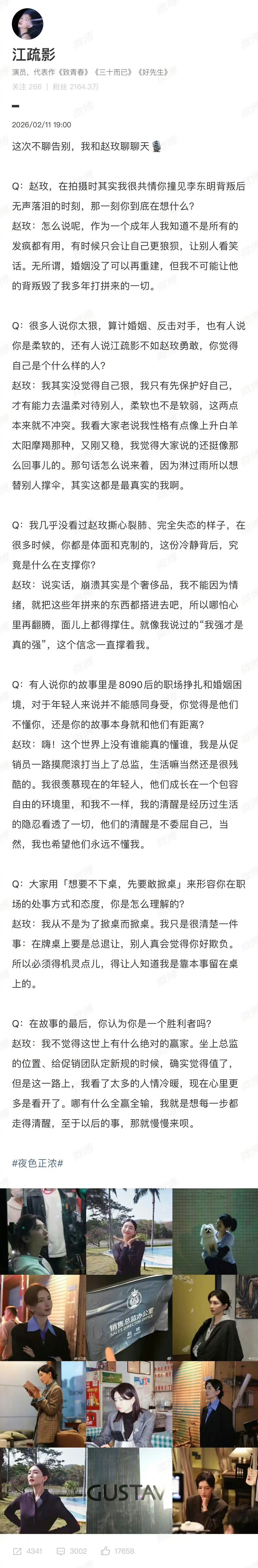 江疏影和赵玫的问与答 看完与赵玫的问与答,真的被这份清醒与通透狠狠戳中。她眼里的赵玫从来不是非黑即白,而是先保护好自己,才有能力温柔待人,柔软不是软弱,刚与柔从来都不冲突。那些体面、克制、冷静,不是冷漠,是被生活捶打过后才长出的铠甲。先爱自己,再爱世界,女性的我本位,从来都不是自私,而是底气。夜色正浓