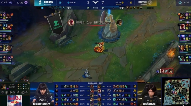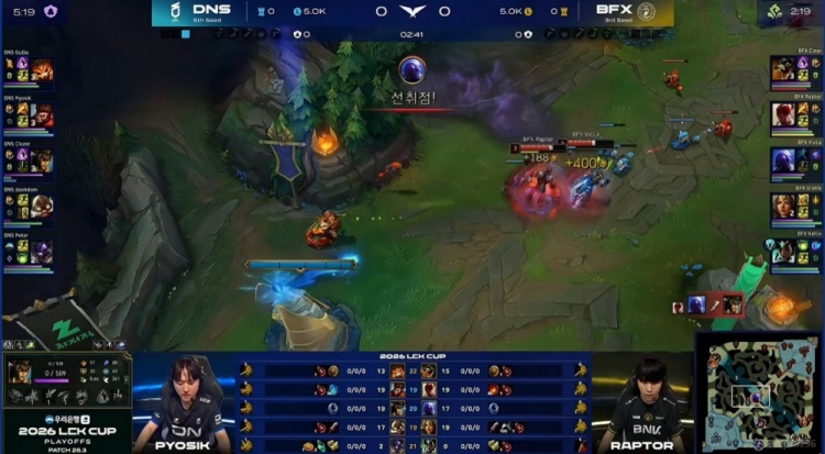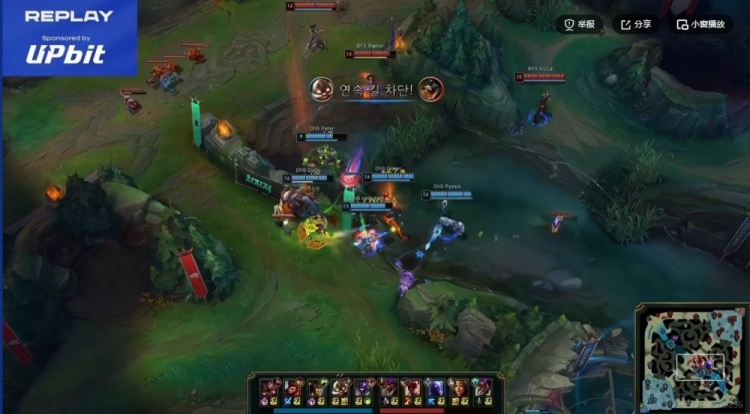 [12:10]野区遭遇,Peter牛头Q闪上去,虽然侧翼DNS切死了VicLa瑞兹,但是正面Pyosik猴子+下路组两人都被留住!这波1换3打完BFX拿下3K经济的优势了!BFX随后控到二小龙!