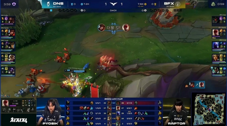[4:01]Raptor盲僧上路磨血,Clear鳄鱼跟进结果一丝血DuDu纳尔变大了啊!Pyosik猴子支援配合大纳尔切死对手上野,Pyosik猴子双杀!DNS的0换2!