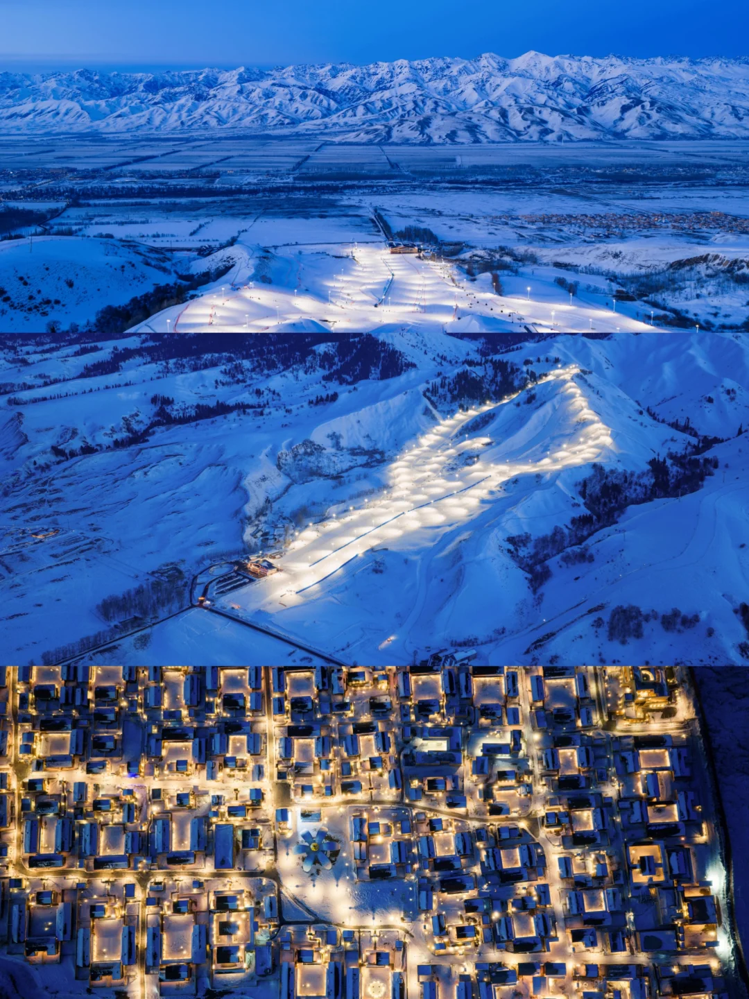 这是那拉提区域文化与美学结合的新地标。58座以独特“伊犁蓝” 装饰的特色院落,在白雪映衬下格外梦幻。可以白天滑雪,晚上在院落里围炉夜话,体验地道的民俗弹唱,享受冰雪中的温暖与惬意。